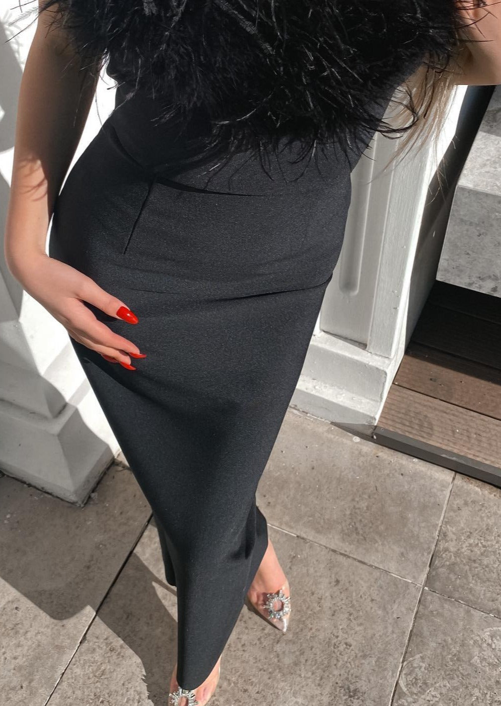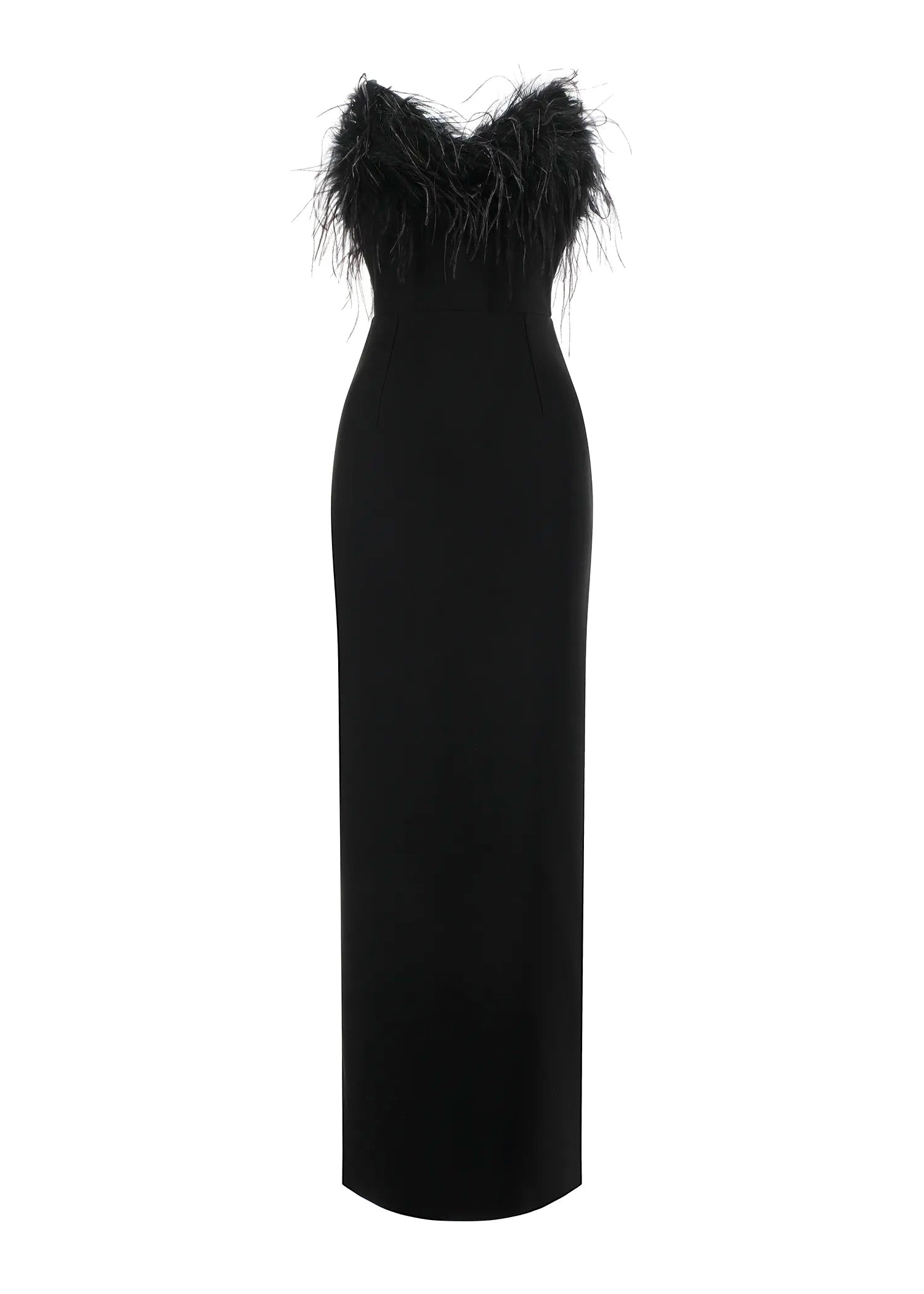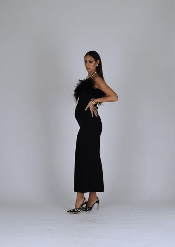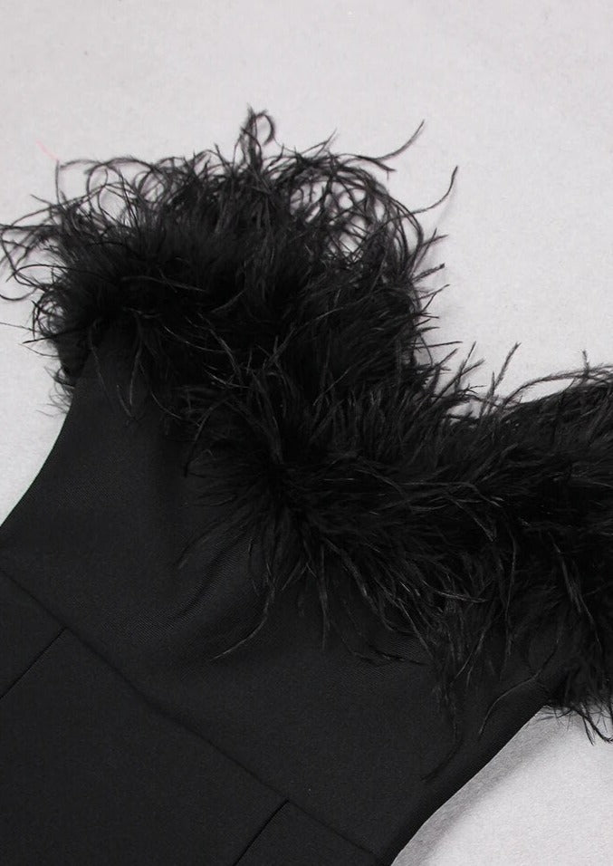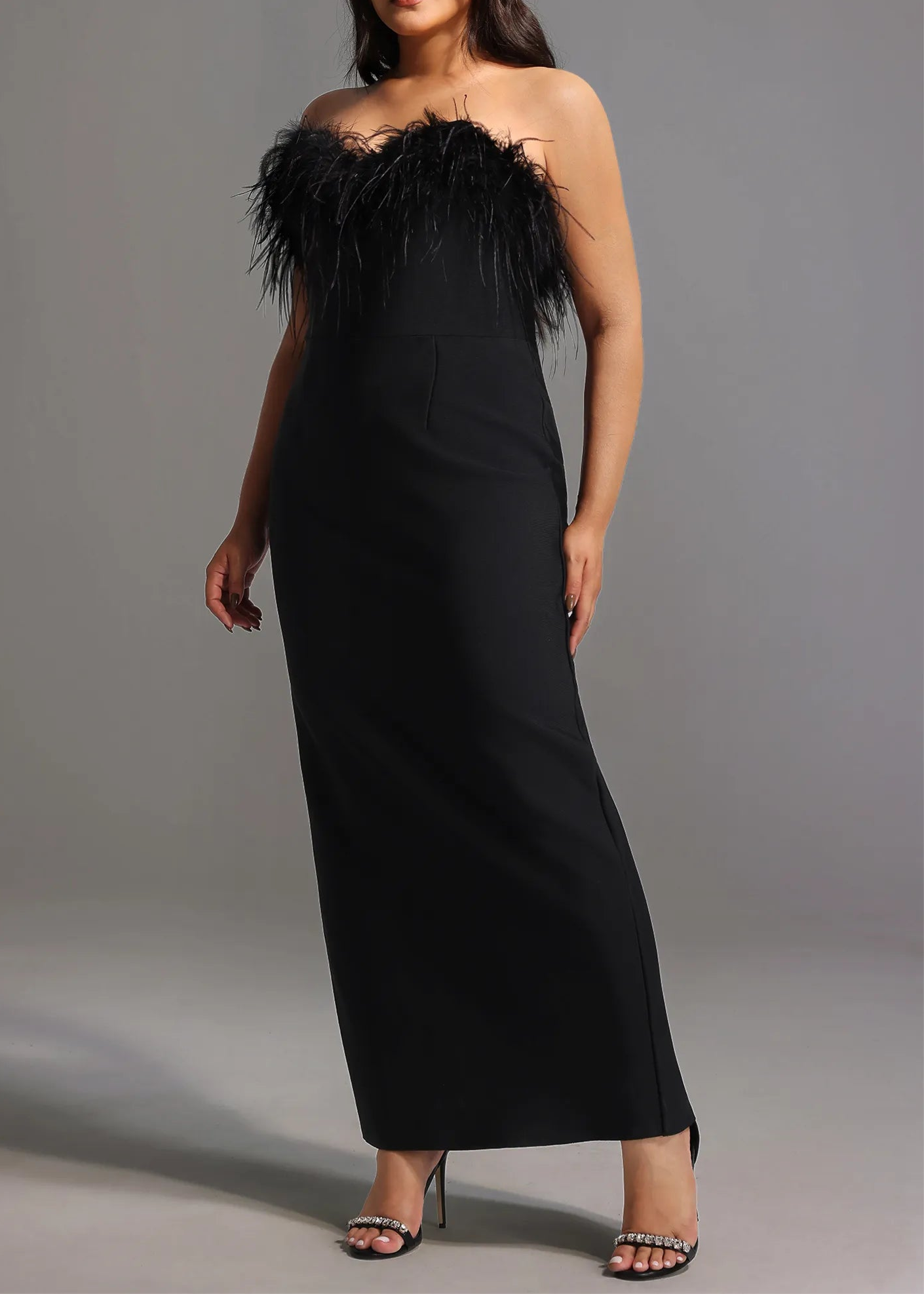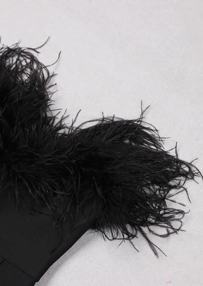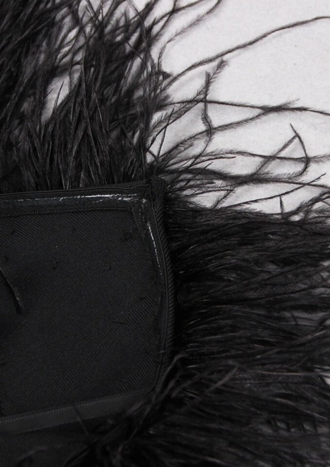 Alessandra is a V-neck style adorned with beautiful ostrich feathers around the bust and back to add a bit of dramatic flair to outfit. Crafted from a thick and luxurious bandage fabrication she hugs you snug with stretch as she lifts and cinches at the same time. Alessandra is ankle length and has a back split and invisible back zip to close. A stunning addition to any wardrobe.