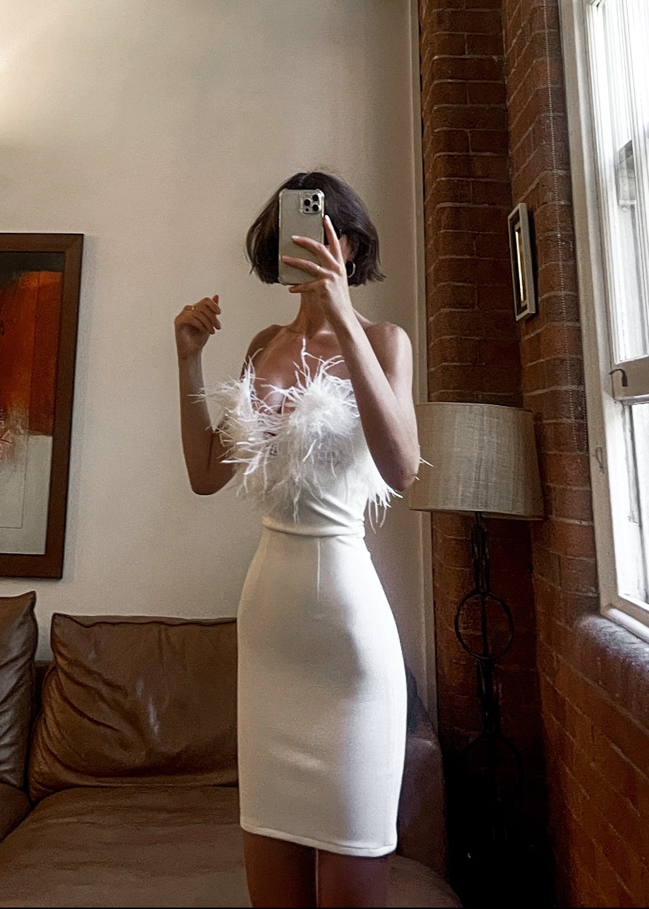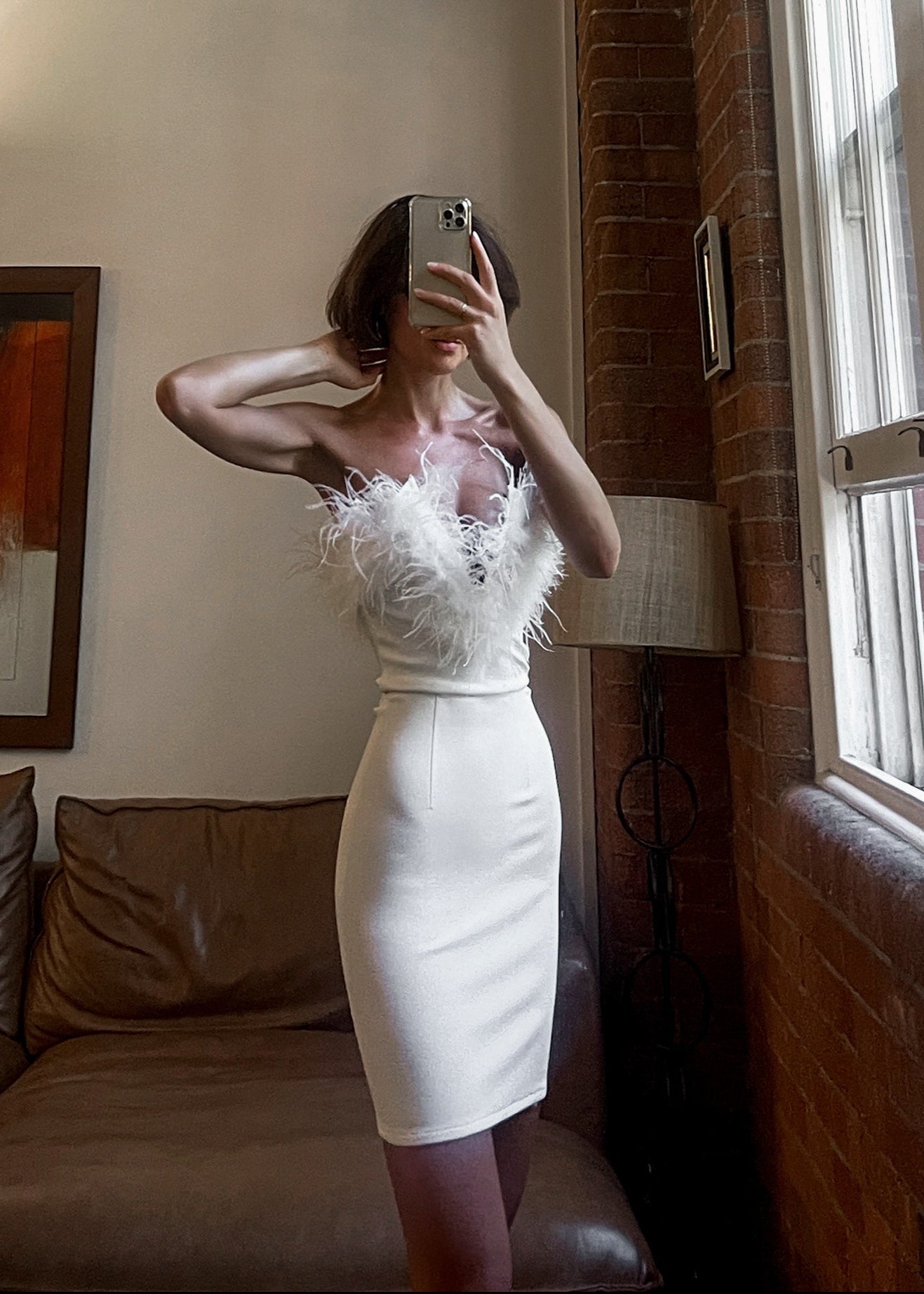 Alessandra is a V-neck style adorned with beautiful ostrich feathers around the bust and back to add a bit of dramatic flair to outfit. Crafted from a thick and luxurious bandage fabrication she hugs you snug with stretch as she lifts and cinches at the same time. Alessandra is an above knee length with invisible back zip to close. A stunning addition to any wardrobe.