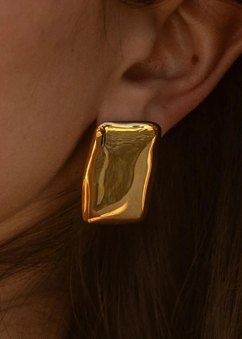 The statement silhouette you're missing. These earrings are handcrafted to be lightweight and easy wearing. Their distorted rectangular shape is crafted from stainless steel and is coated in durable platings with physical vapor deposition (PVD). This vacuum coating process produces a brilliant finish to the base metal to provide an extremely durable coating. They are waterproof, nikel free and hypoallergenic and will be sure to last. Suitable for pierced ears, they feature a butterfly stud to secure.