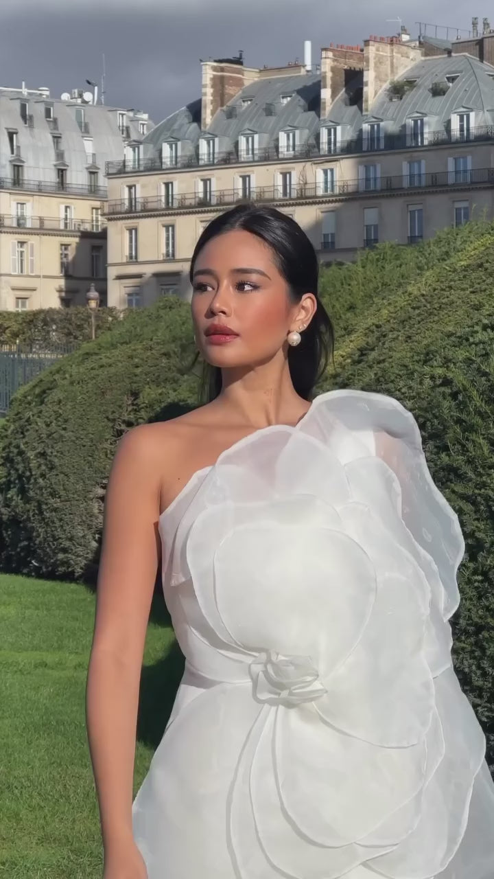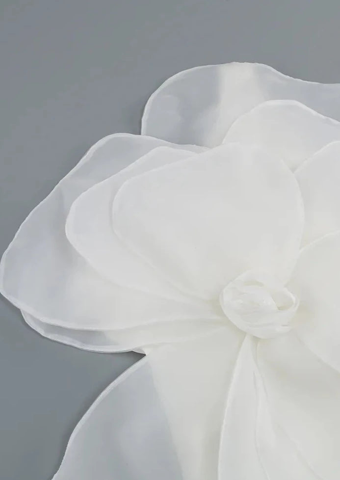 Made for a moment. This delicately designed one shoulder mini dress is crafted from the finest layers structured organza to create this statement oversized floral appliqué. This stunning three dimensional flower adornment is a work of art and designed to stand out. The Eden dress itself is lightweight, non-stretch and includes an invisible back zip to close.