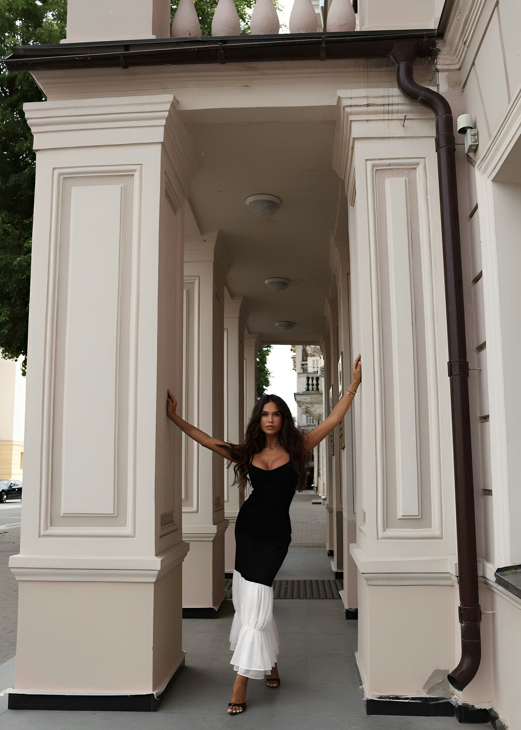 Featuring a sculpting black bodice with slim adjustable shoulder straps and a softly curved neckline, this silhouette hugs in all the right places. She falls elegantly into contrasted voluminous ivory tiered panels that move for a dramatic flow with graceful fluidity. Wear with ease with invisible side zip with hook and eye to close.