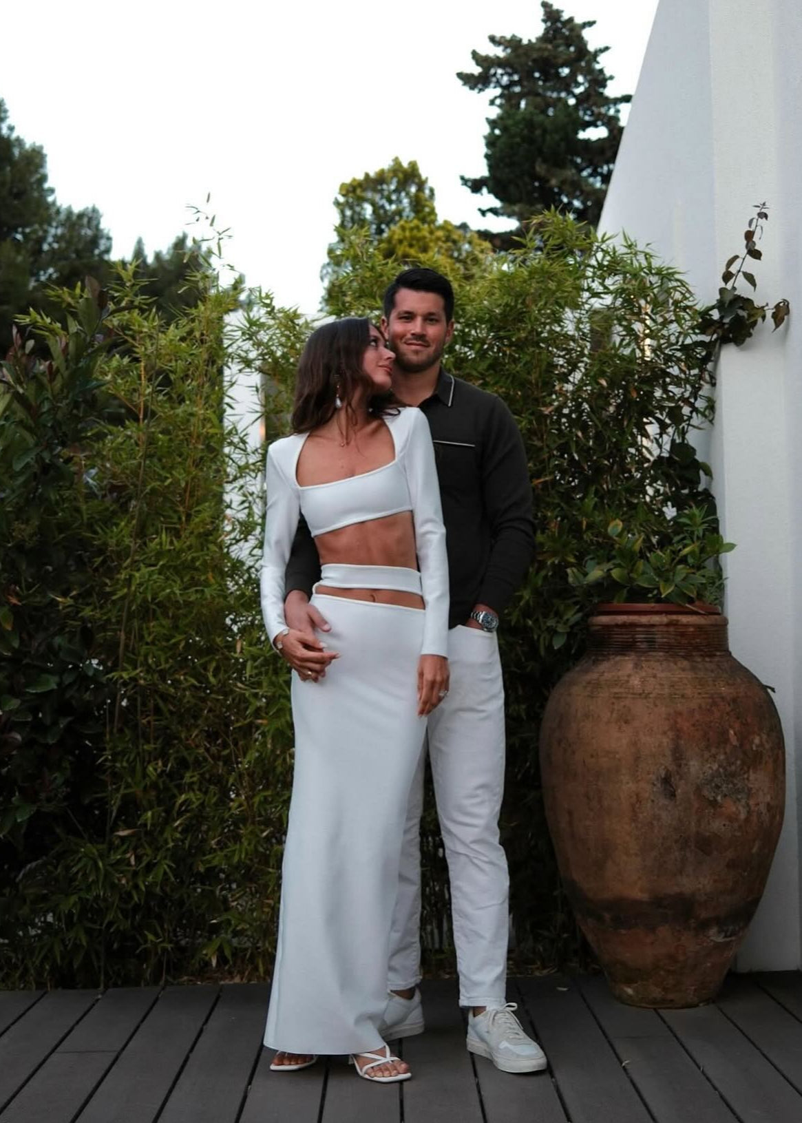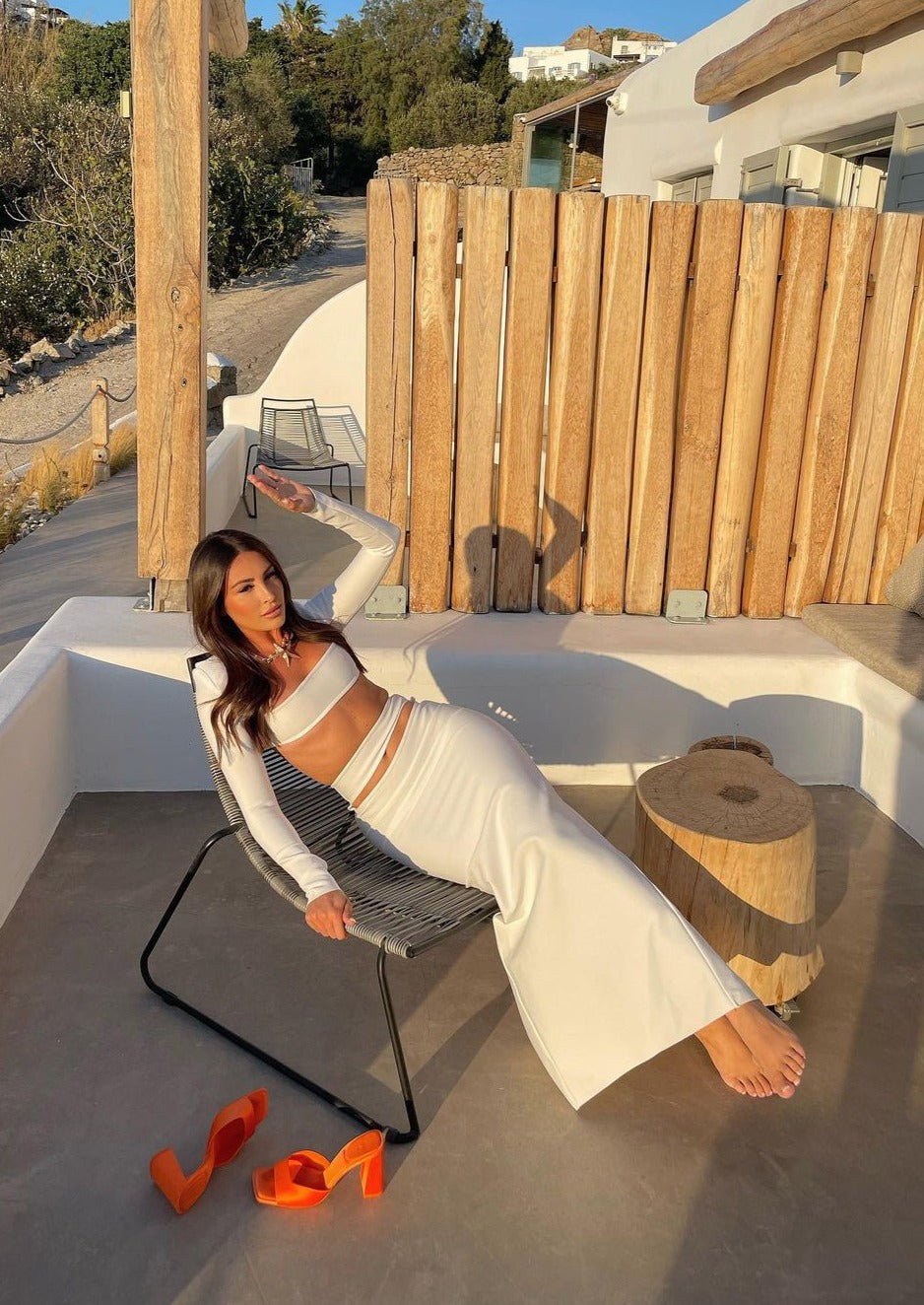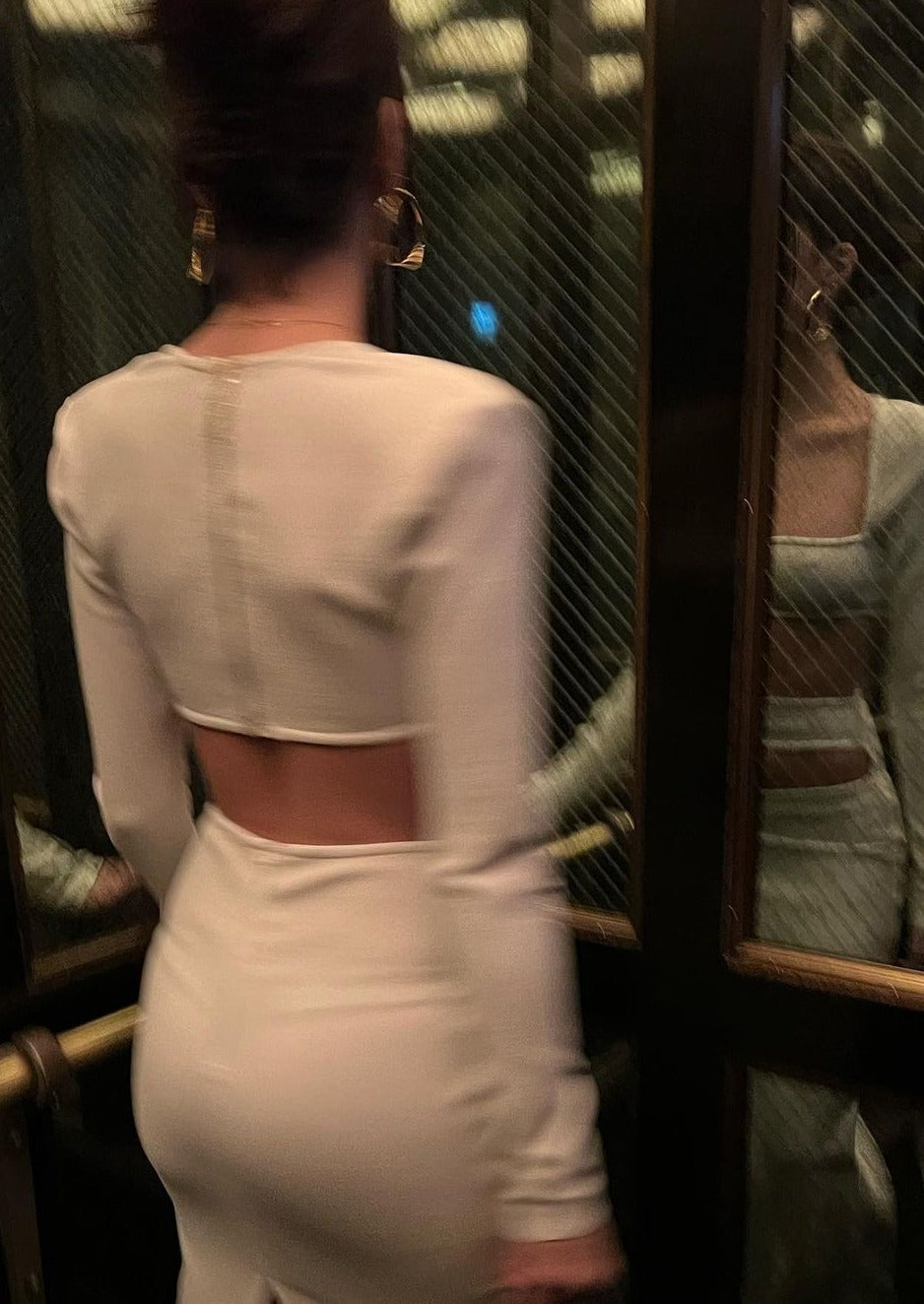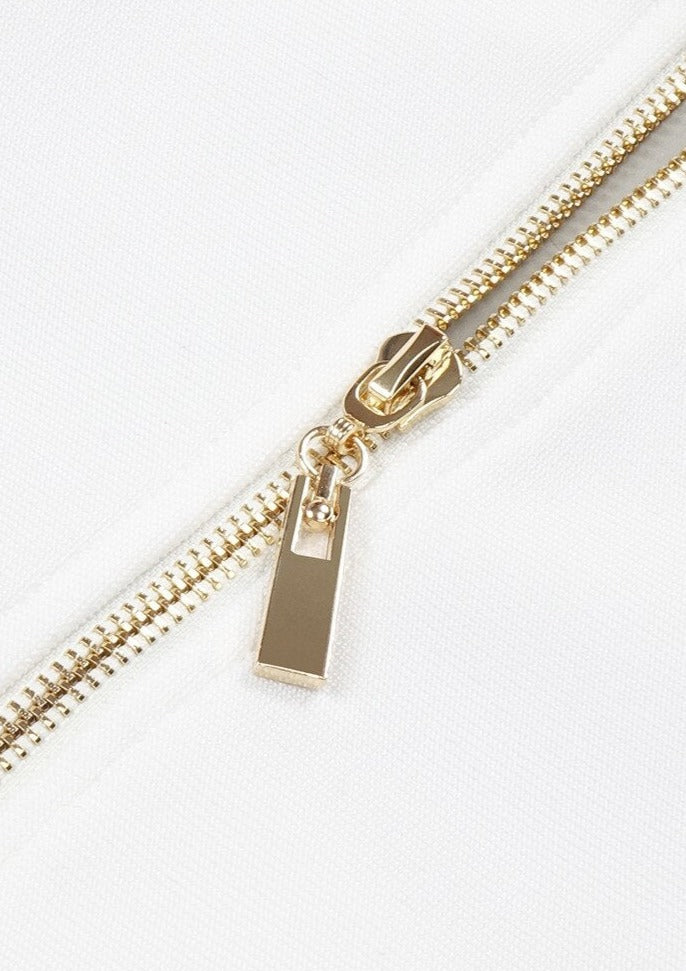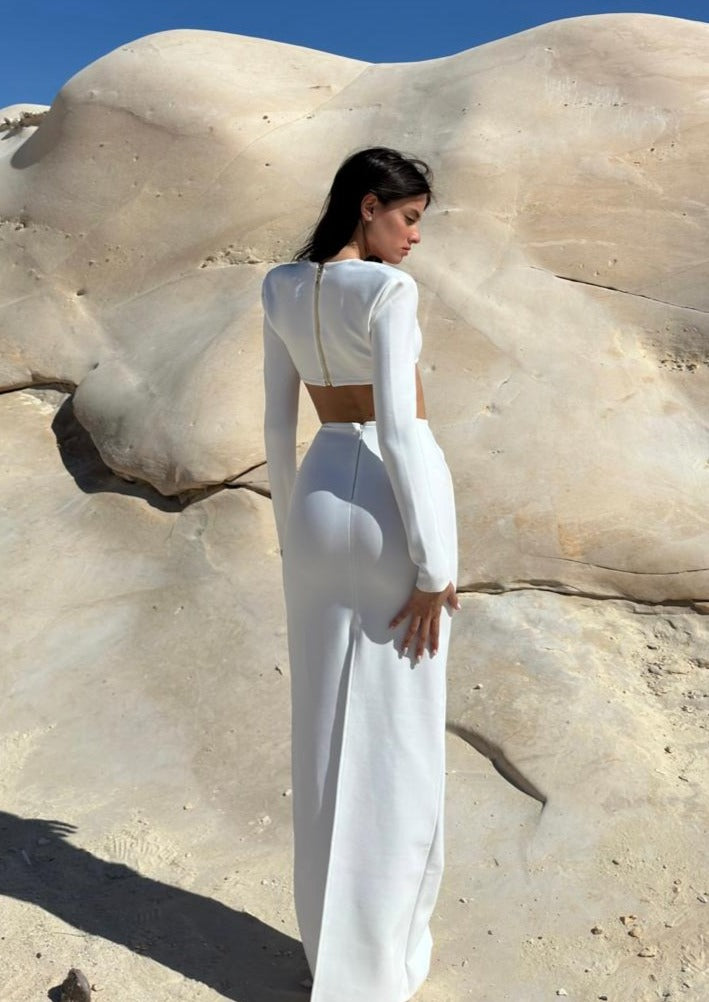 For the bold. This two piece top and skirt set are for those wanting to stand out. This chic ensemble is crafted from a superior thick and high stretch fabrication. The long sleeved top is fitted with a scooped square neckline and features small shoulder pads, a non-slip silicone trace around the bust and a luxurious high quality gold back zip to close. The high waisted matching skirt is floor length and features a knee-high back split, midriff cut out also with a non-slip silicone trace to stay in place, and an invisible back zip to close.