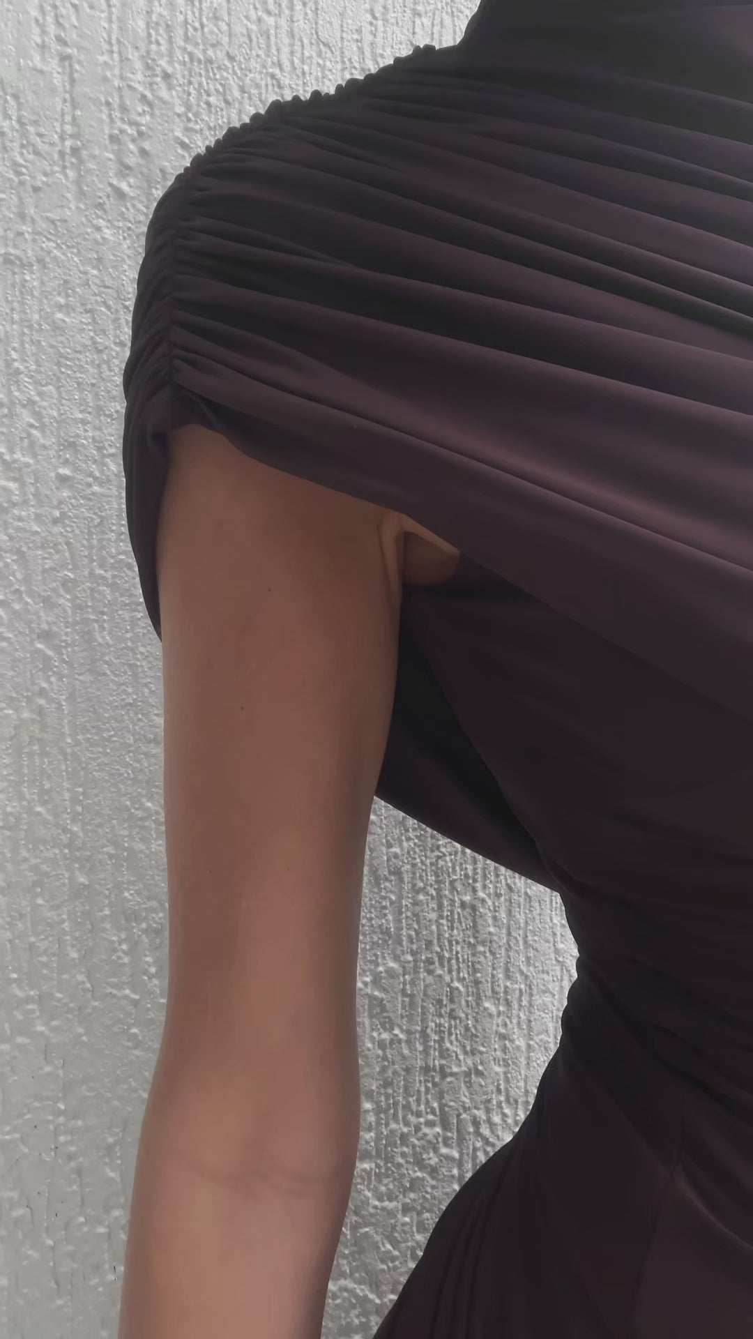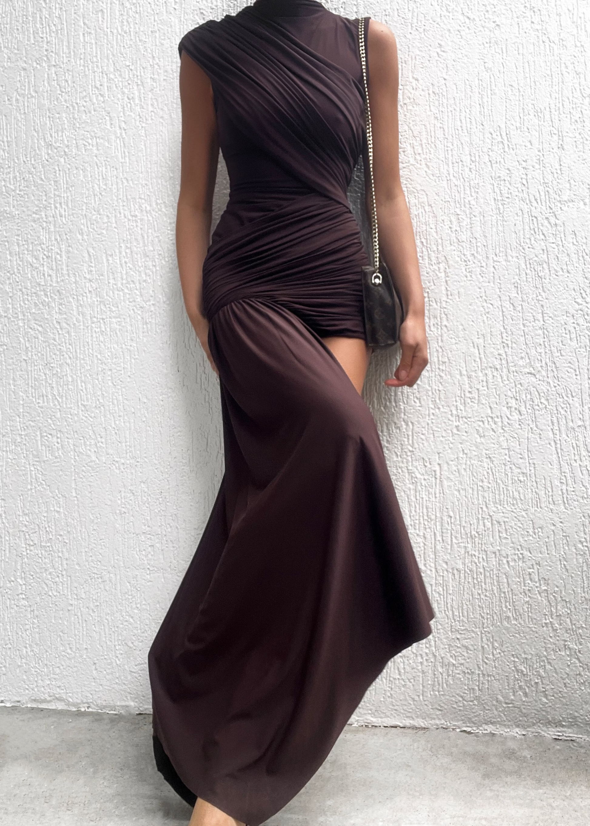 Gia is a study in modern seduction, sculpted to embrace and celebrate every curve. Cut from a luxurious premium stretch jersey in a rich espresso shade, its artful ruching contours the body while an asymmetric neckline and shoulder detail add architectural intrigue. The fitted mini base is contrasted by a fluid, floor-length drape, creating a striking balance of elegance and allure. Perfect for evenings that call for unapologetic confidence.