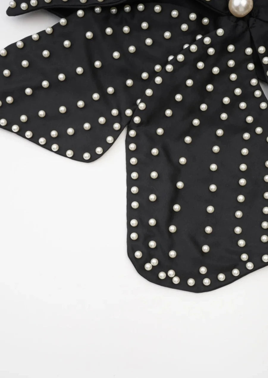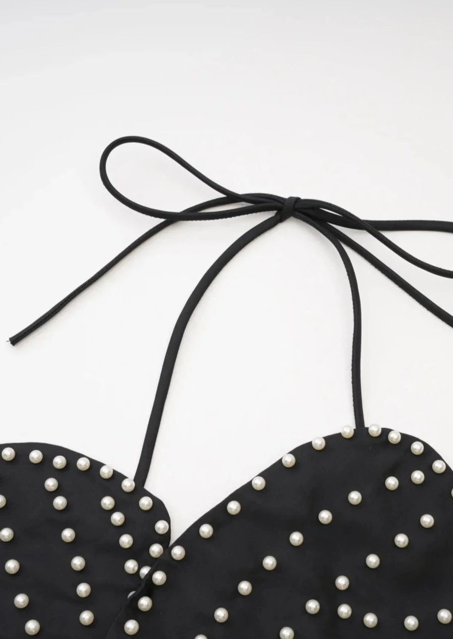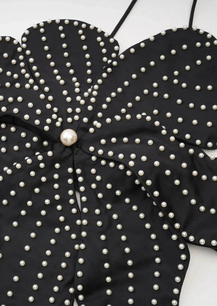 Jacques is truly a work of art and will have heads turning everywhere you go. Each individual small pearl is securely studded through a superiorly structured satin fabrication and will not be going anywhere. Featuring a soft thick elastic back band and halter neck tie, there is room for all sizes whilst staying secure. Have your backless moment while the petals elegantly bloom out and around to you.