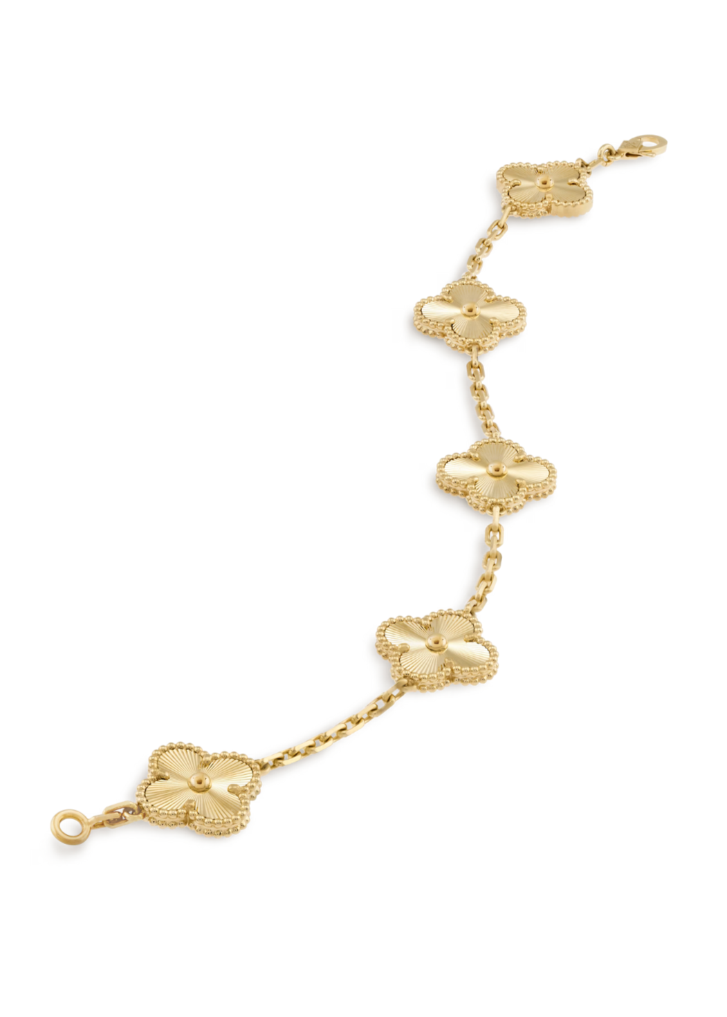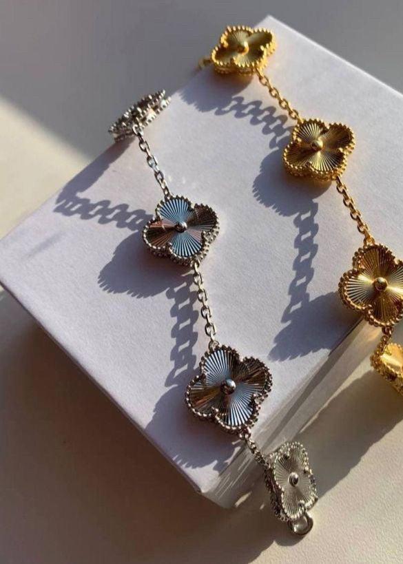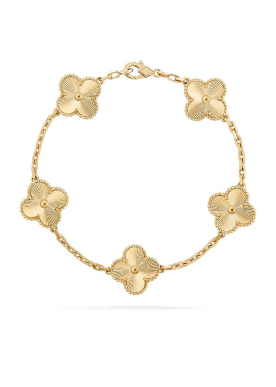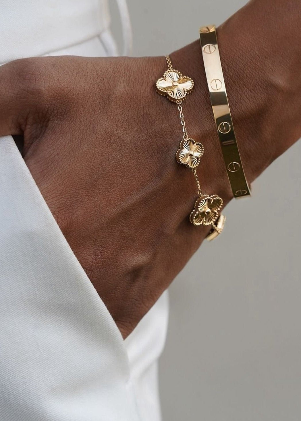 This elegant bracelet is the perfect simple statement for any outfit. Crafted from fine titanium stainless steel, Majorelle is coated in 18K yellow gold plating and is waterproof and hypoallergenic. Featuring five four leaf clover pendants with dainty outline beads and sturdy lobster claw to close, she is the perfect elegant touch to add to any outfit. Layer up or wear on her own.