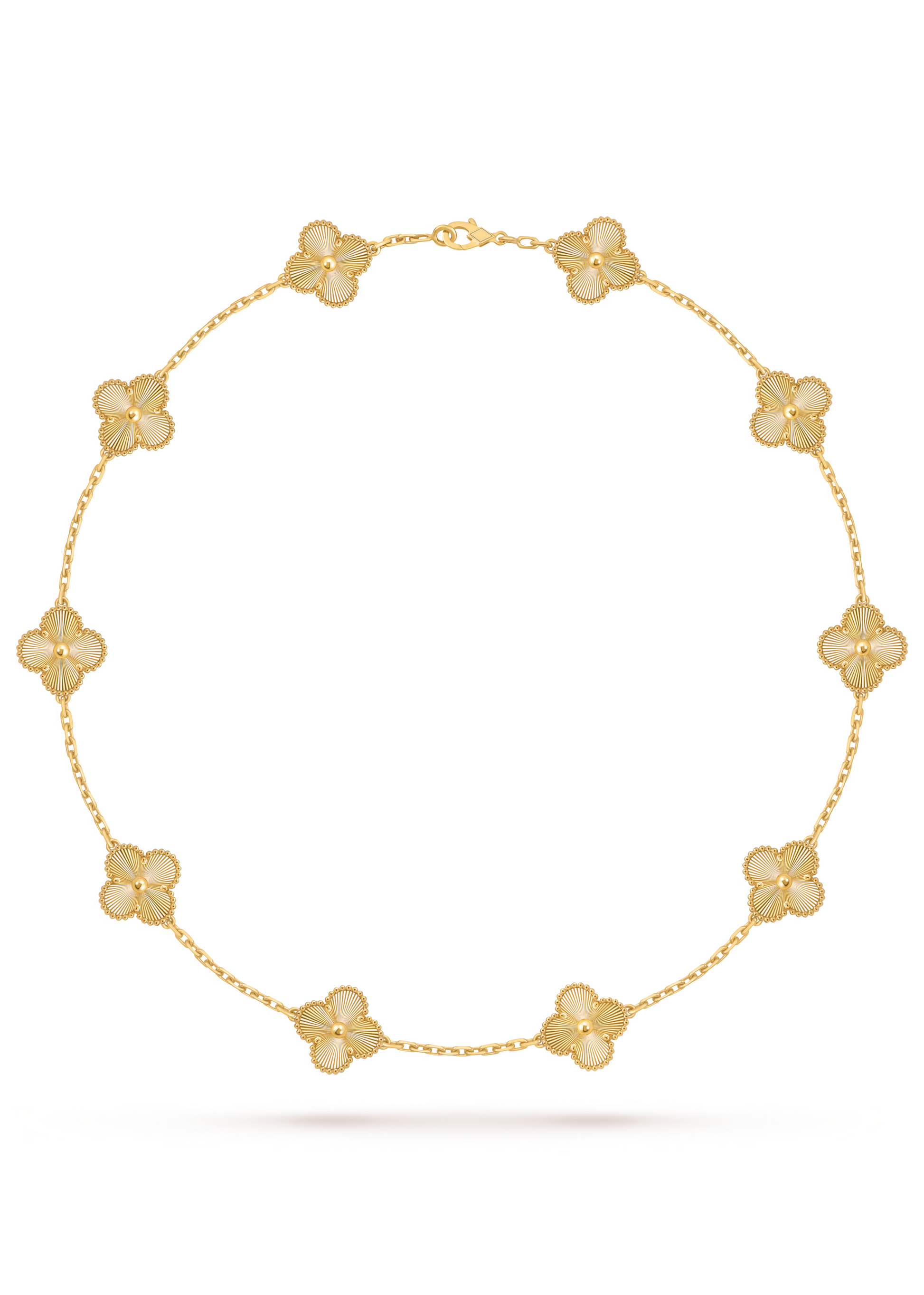 This elegant necklace is the perfect simple statement for any outfit. Crafted from premium titanium stainless steel, Majorelle is coated in an 18K yellow gold plating and is waterproof and hypoallergenic. Featuring ten double sided four leaf clover pendant with dainty outline beads, the motif's textured gold face is double sided for optimum wear. Featuring an adjustable chain length to suit, she is the perfect touch to elevate any outfit. Layer up or wear on her own.