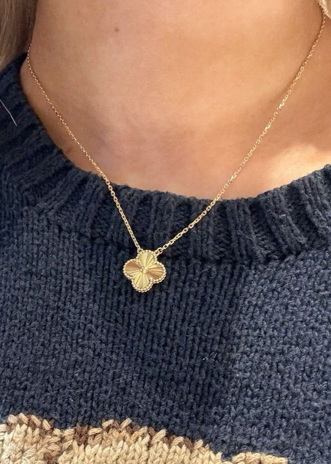 This elegant necklace is the perfect simple statement for any outfit. Crafted from premium titanium stainless steel, Majorelle is coated in an 18K yellow gold plating and is waterproof and hypoallergenic. Featuring one double sided four leaf clover pendant with dainty outline beads, the motif's textured gold face is double sided for optimum wear. Featuring an adjustable chain length to suit, she is the perfect touch to elevate any outfit. Layer up or wear on her own.