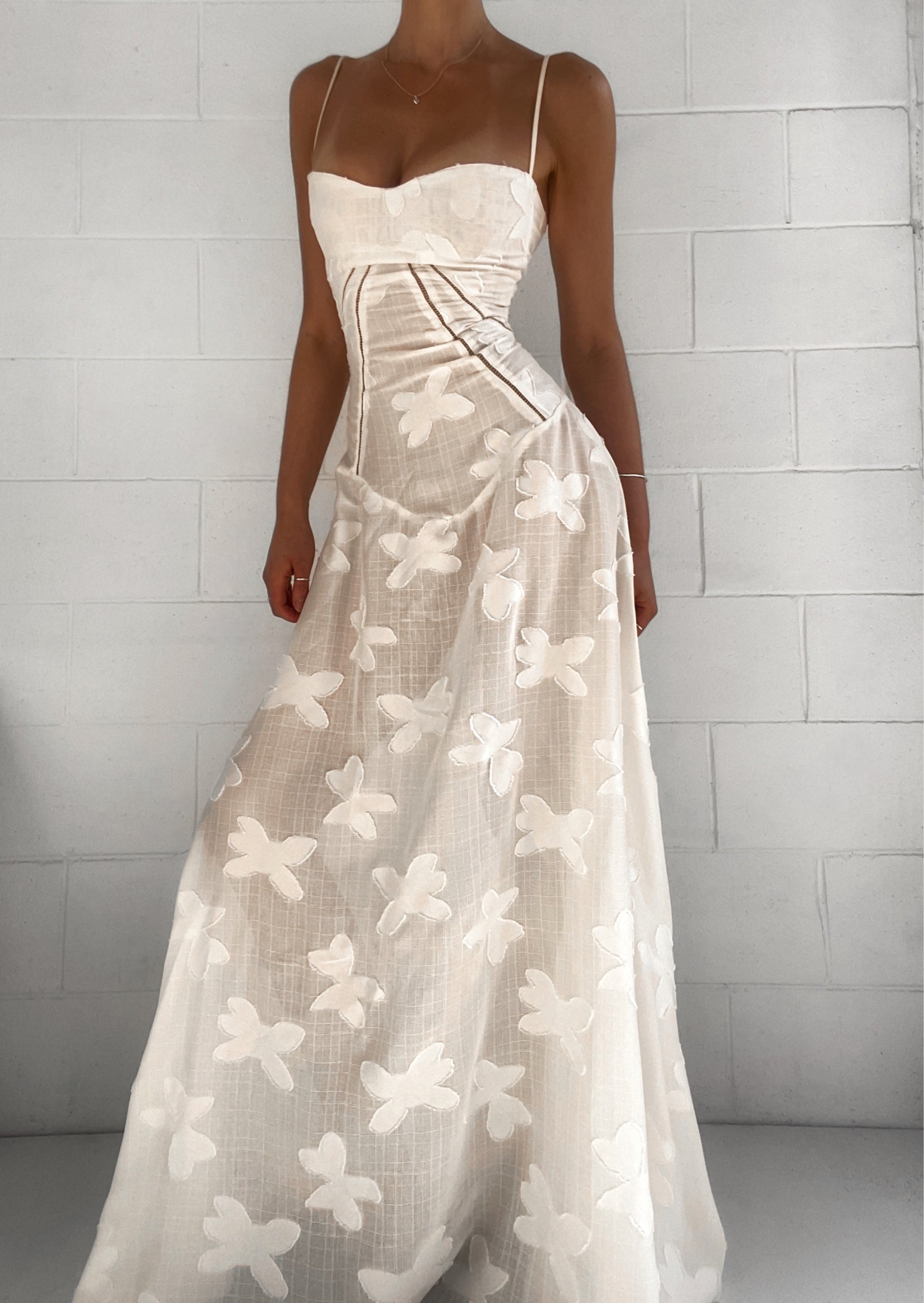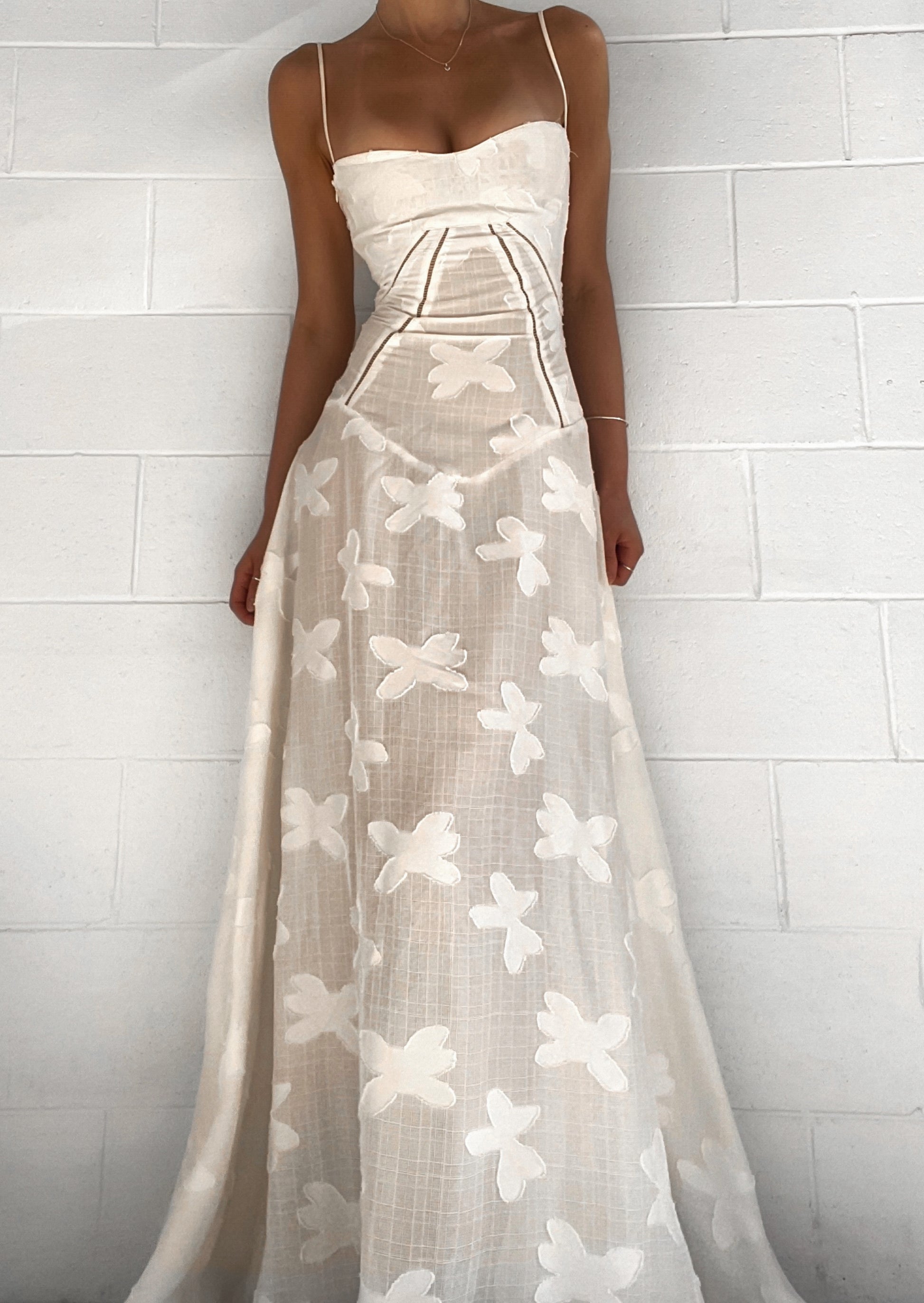 Effortlessly romantic, this vintage cream dress is crafted from a luxurious textured jacquard fabrication adorned with soft patterned floral swatches. The bodice is structured with a curved hem to sit just below the natural waistline so the skirt cascades whimsically to a maxi length. The corsetry style back has boning and high quality rouleau straps to cinch the waist and enhance the divine feminine silhouette.