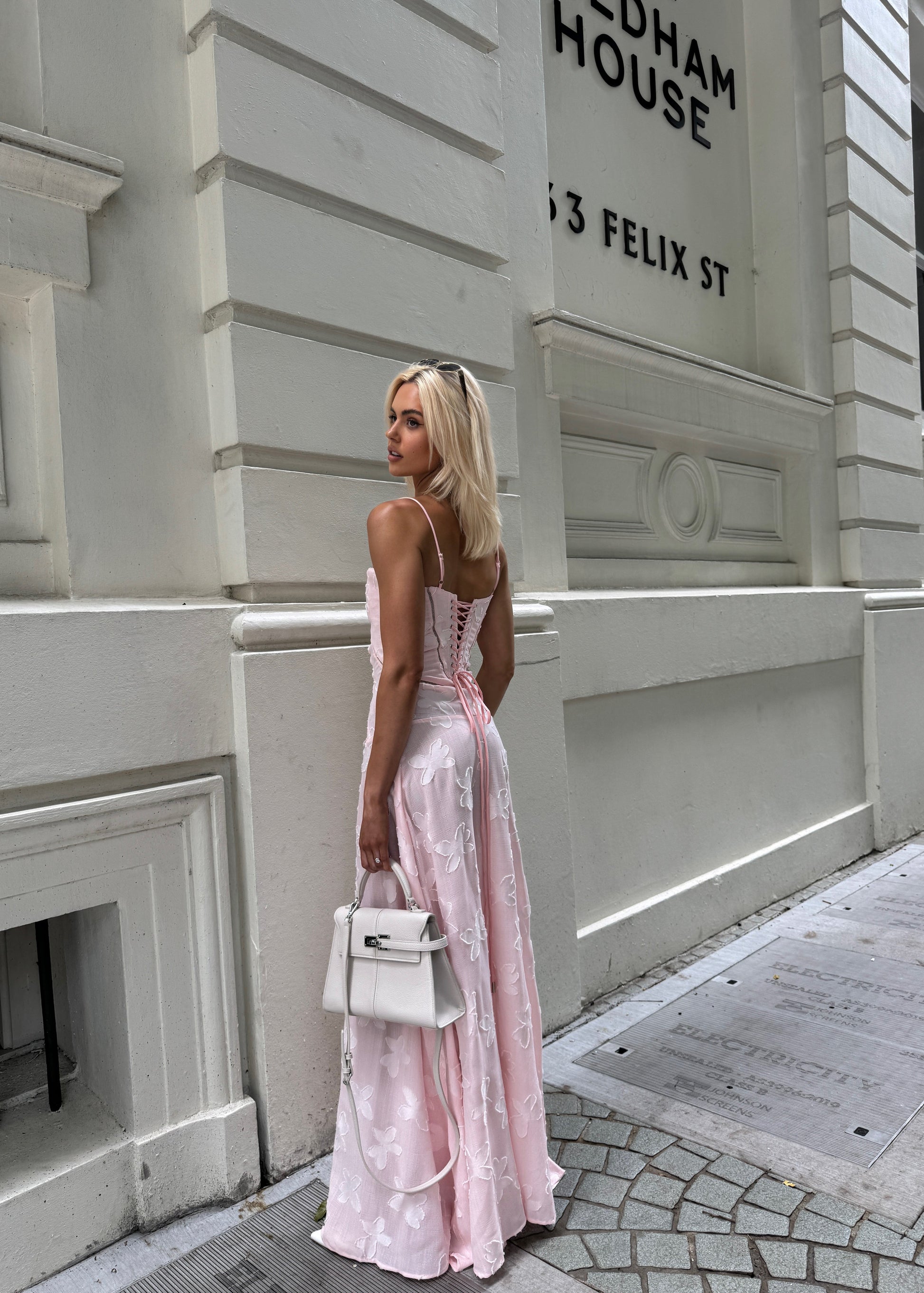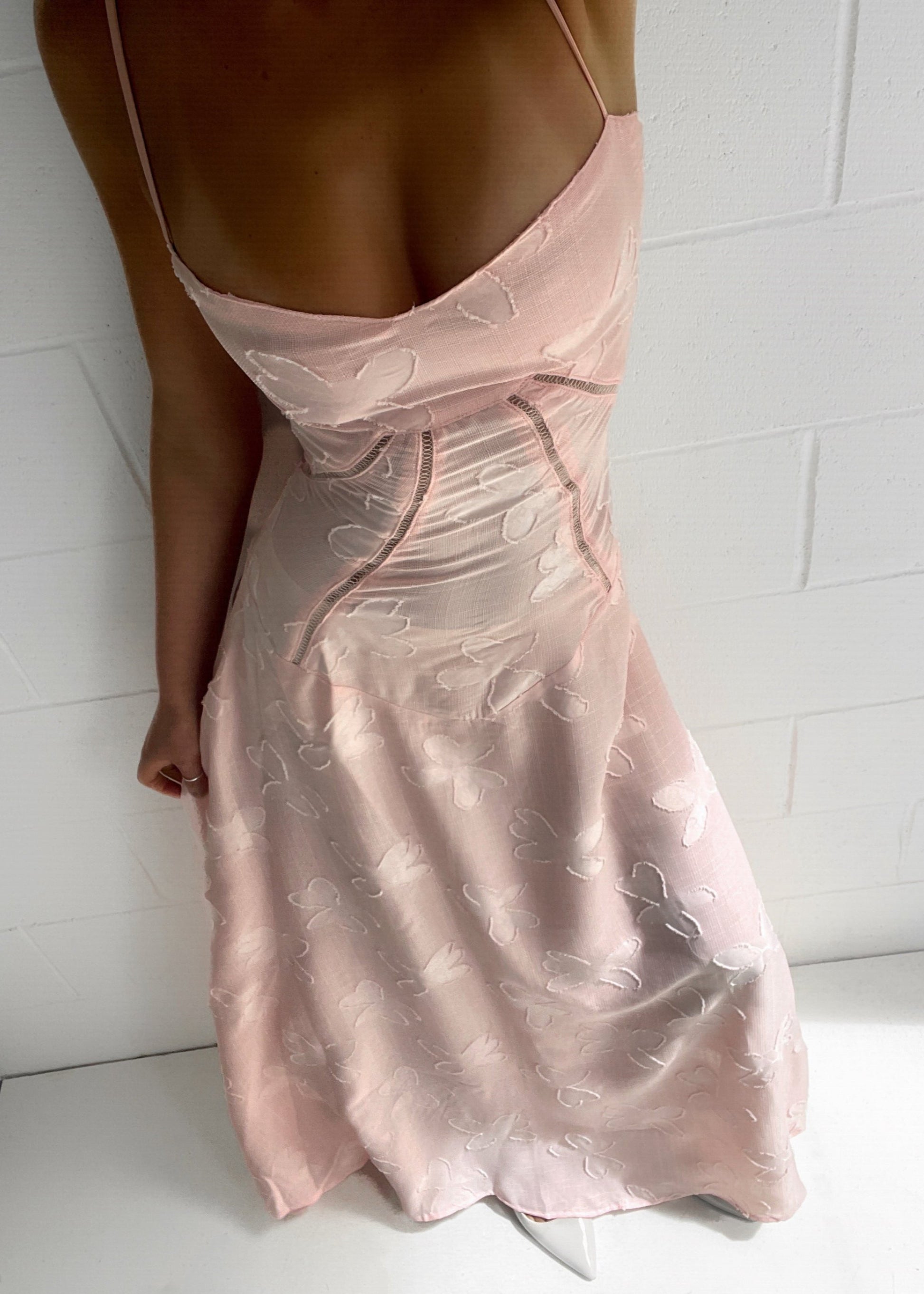 Effortlessly romantic, this vintage pink dress is crafted from a luxurious textured jacquard fabrication adorned with soft patterned floral swatches. The bodice is structured with a curved hem to sit just below the natural waistline so the skirt cascades whimsically to a maxi length. The corsetry style back has boning and high quality rouleau straps to cinch the waist and enhance the divine feminine silhouette.