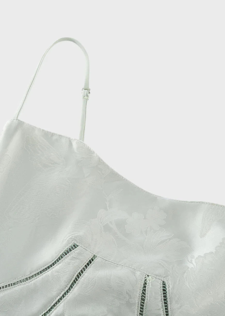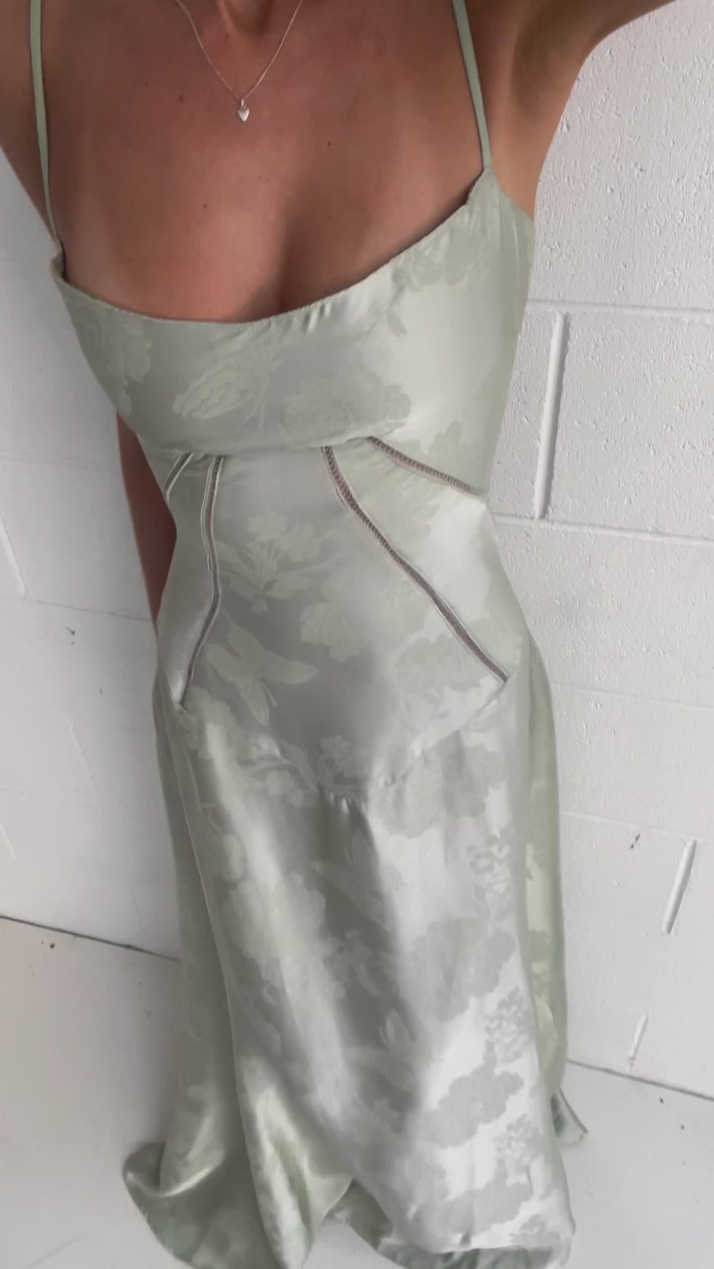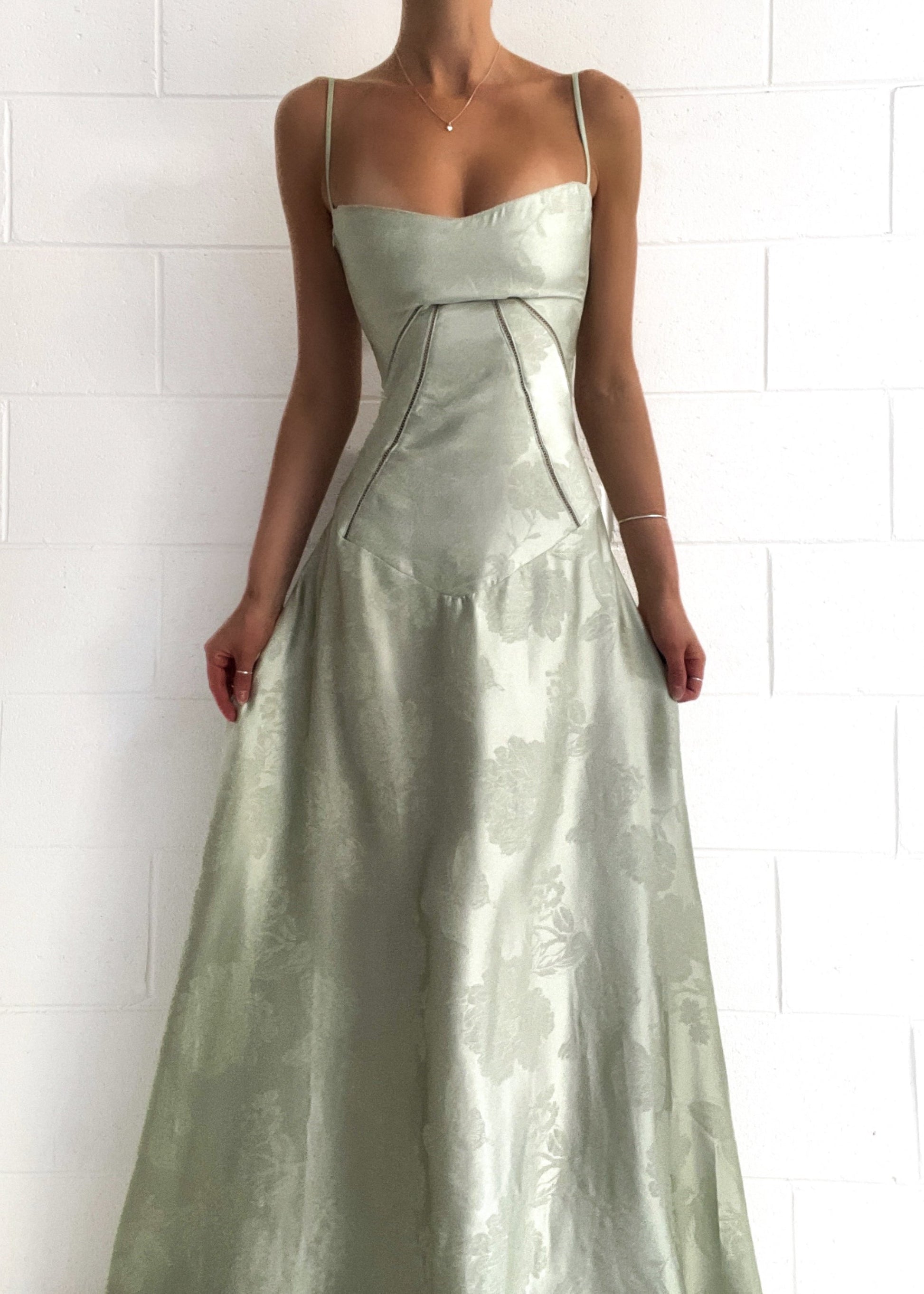 Effortlessly romantic, this vintage green dress is crafted from a luxurious textured satin fabrication adorned with soft patterned floral swatches. The bodice is structured with a curved hem to sit just below the natural waistline so the skirt cascades whimsically to a maxi length. The corsetry style back has boning and high quality rouleau straps to cinch the waist and enhance the divine feminine silhouette.