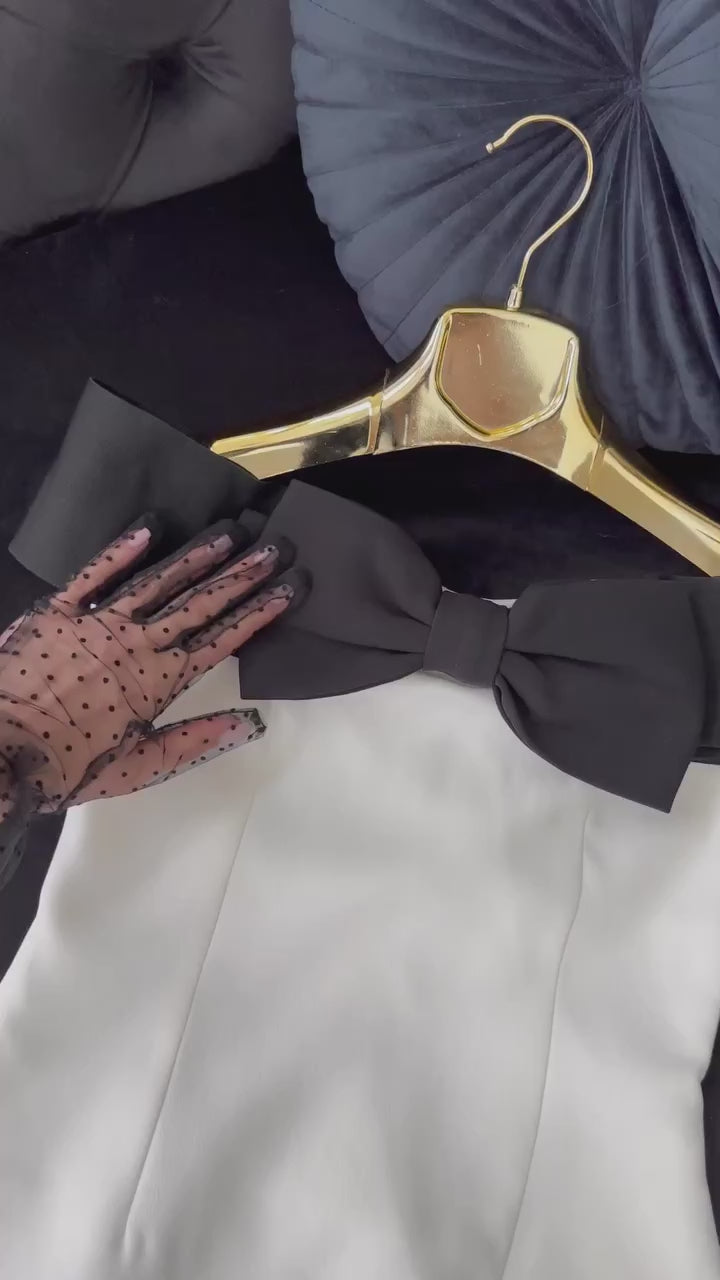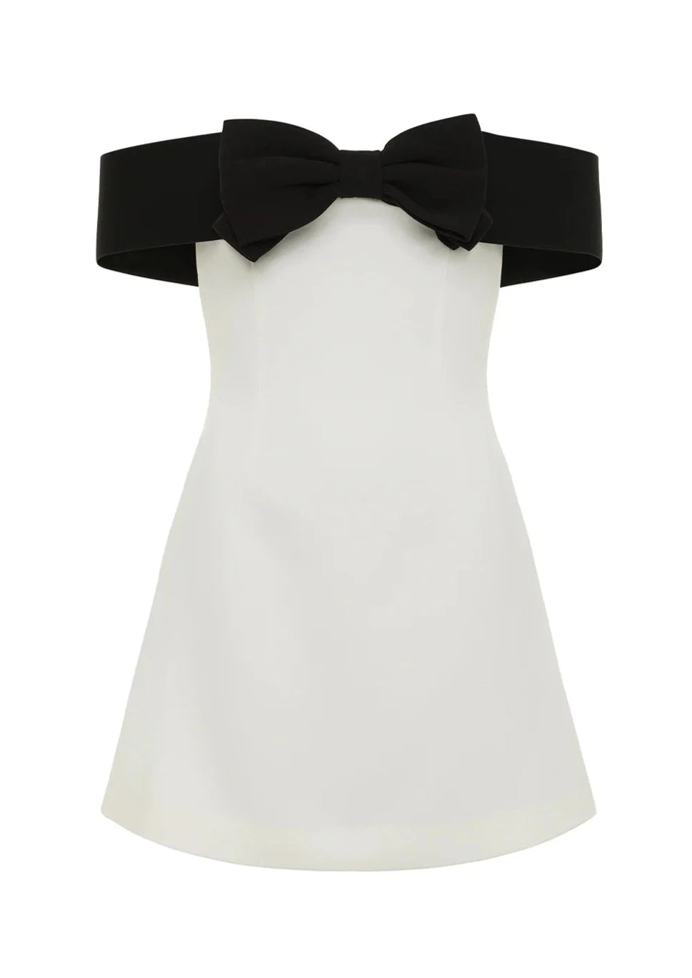 Simple, classic and elegant. Margot is here for your next event. This stunning white a-line mini dress features a lavish black shoulder bow that can be worn on or off, offering the perfect stretch for optimal comfort. She features two side pockets because who doesn't love them and an invisible back zip to close. It's that kind of dress that makes you look twice.