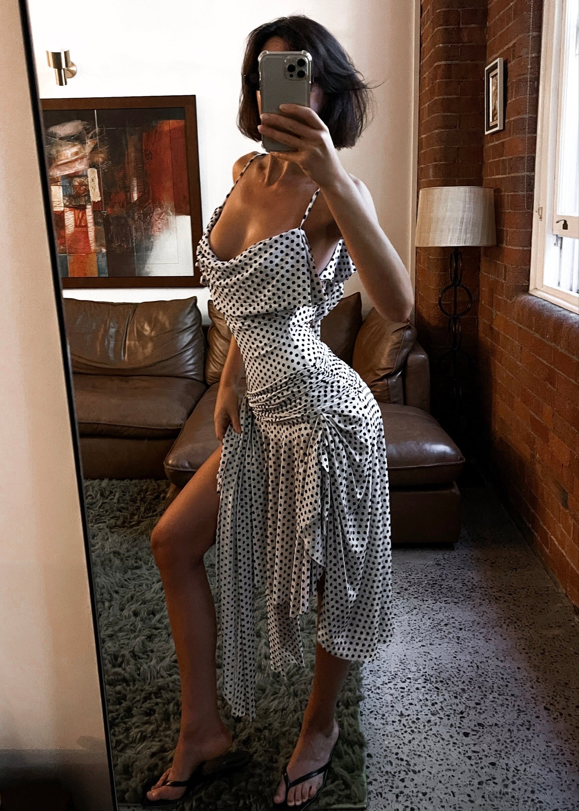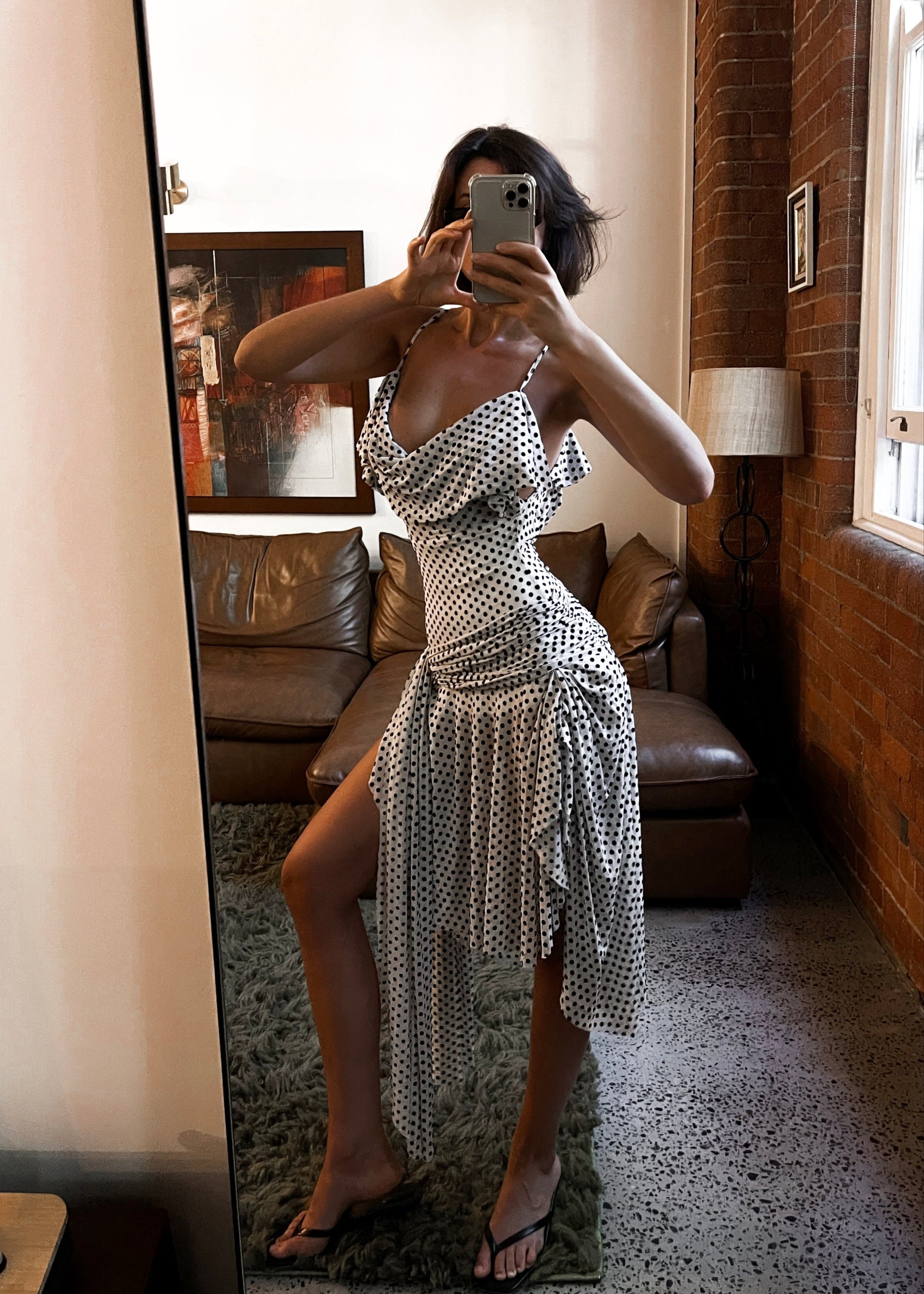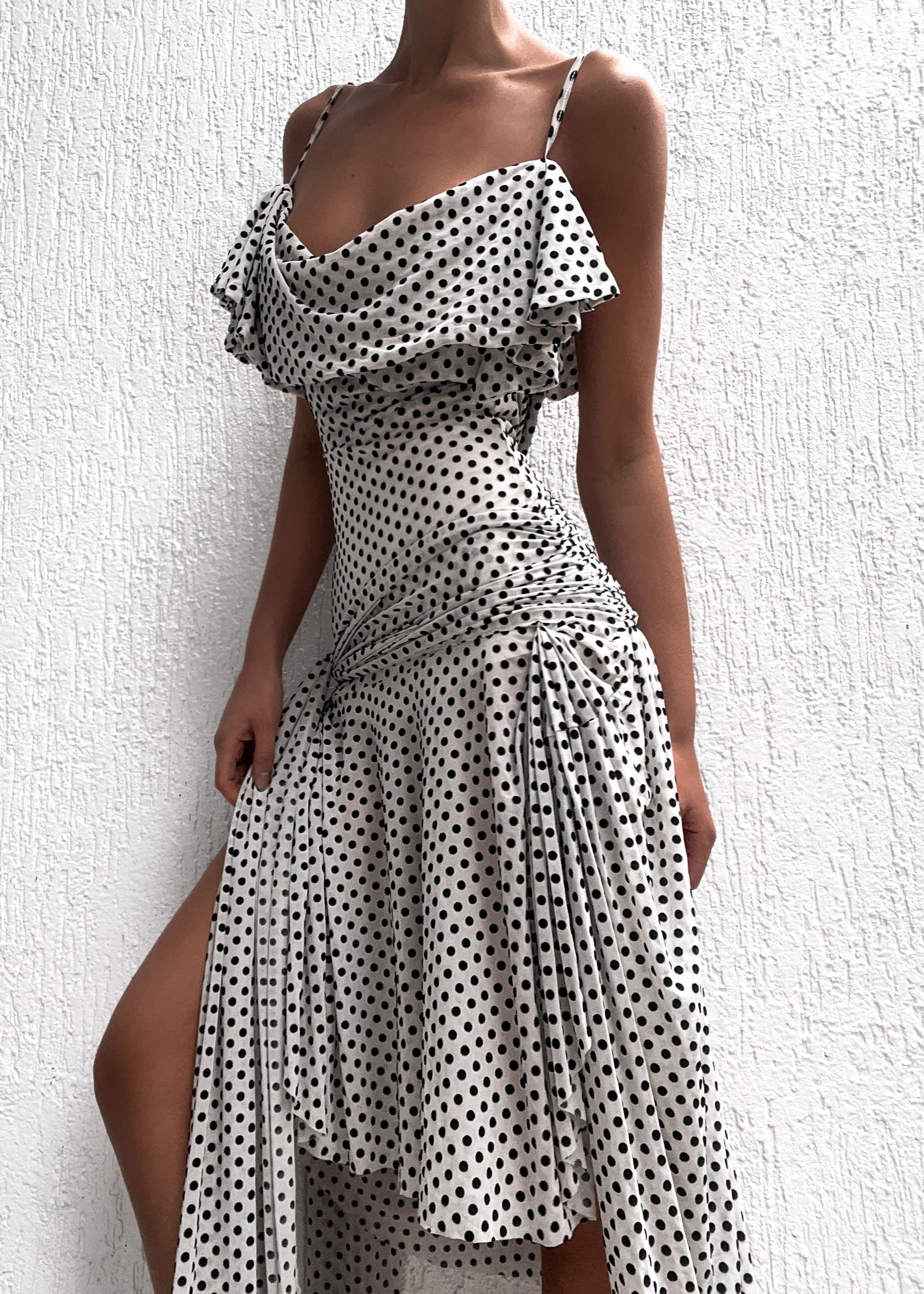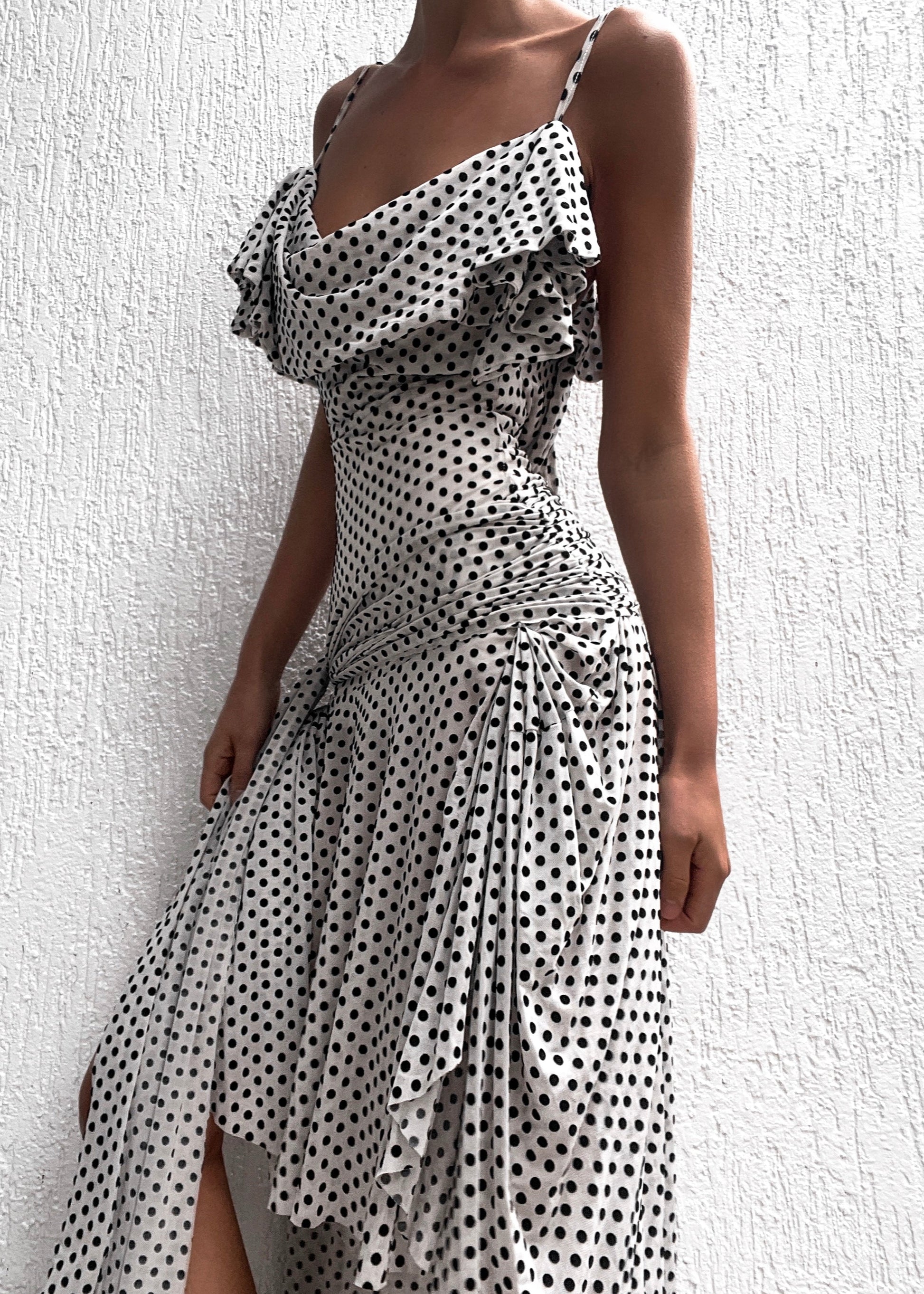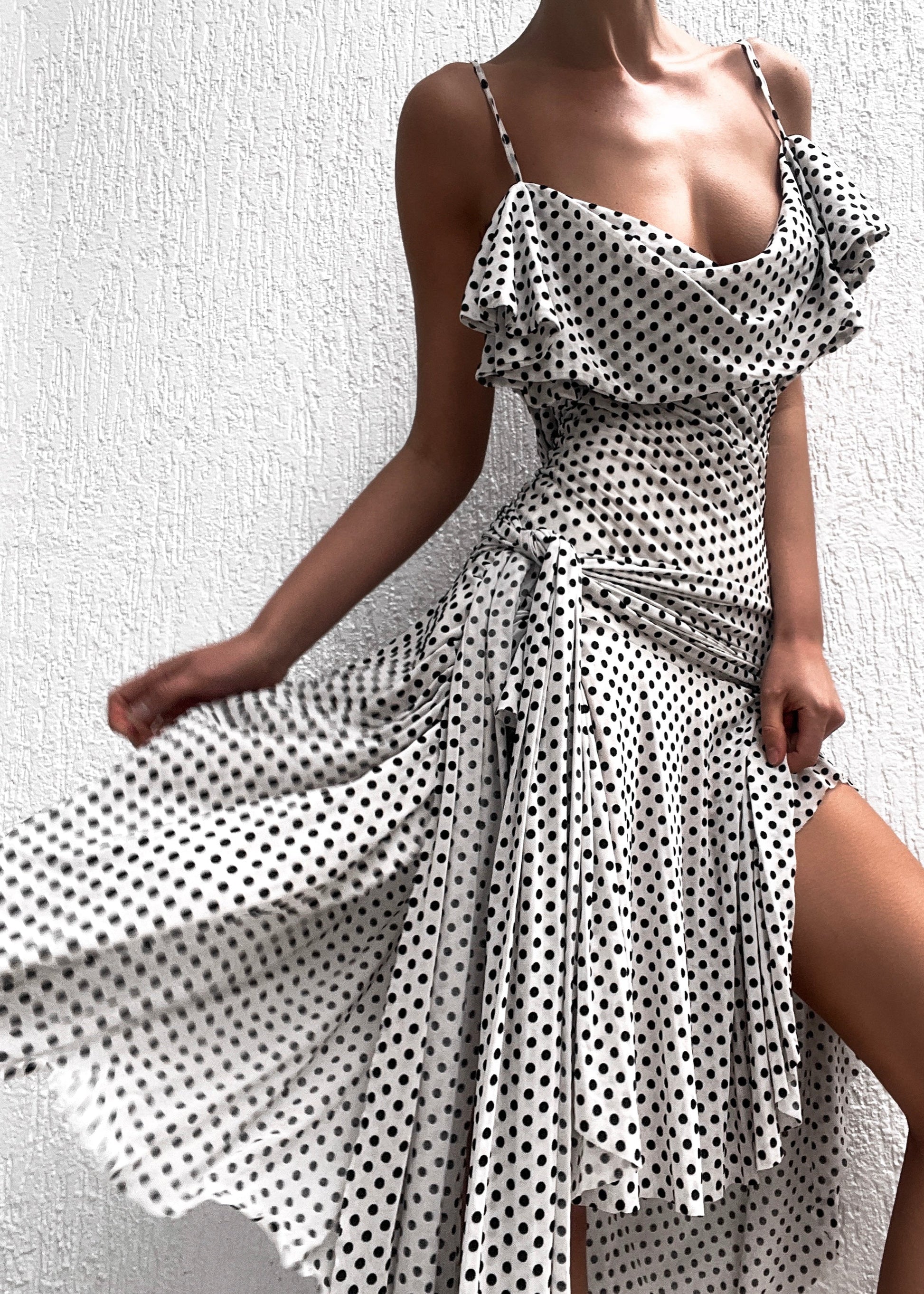 Designed in a wrap-style silhouette, she features a plunging neckline framed by delicate spaghetti straps and a softly draped bodice. The high-low hemline creates a sense of flow with every step, while the sleeveless cut adds ease and versatility. Better yet, this style can be worn multiple ways, draped off and around the shoulder or tied tighter or looser at the waist, to suit your shape and your mood. A true day-to-night showstopper.