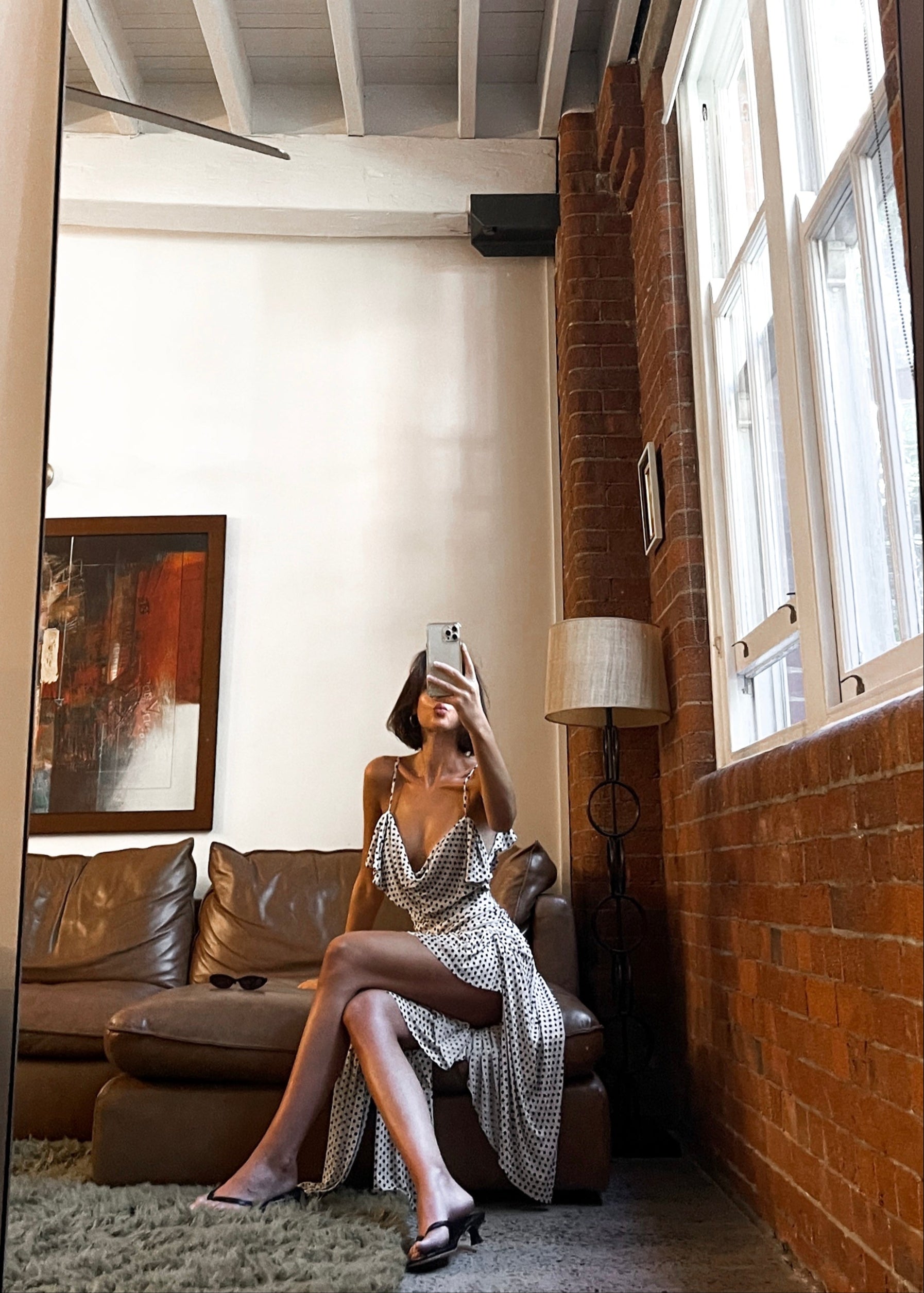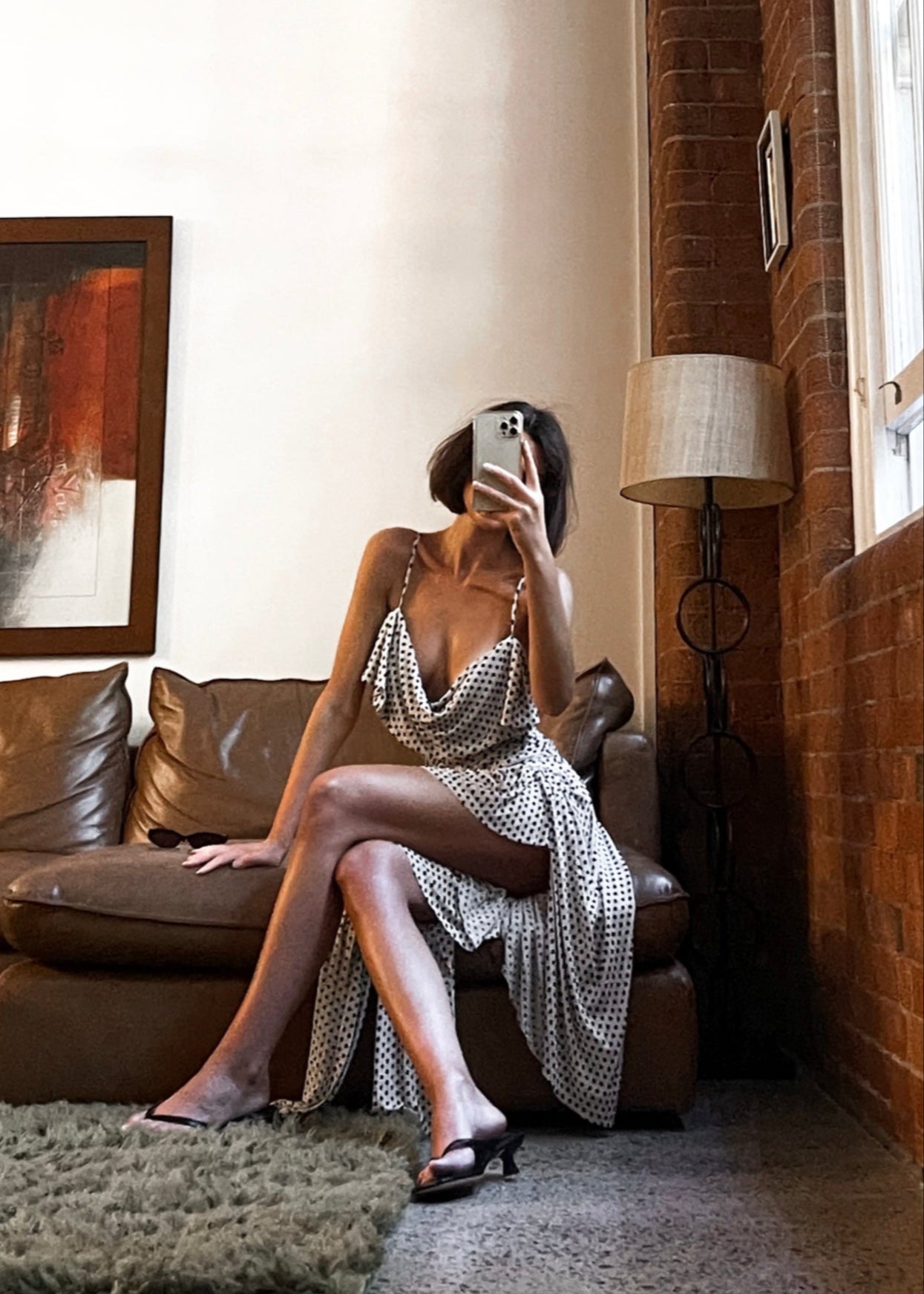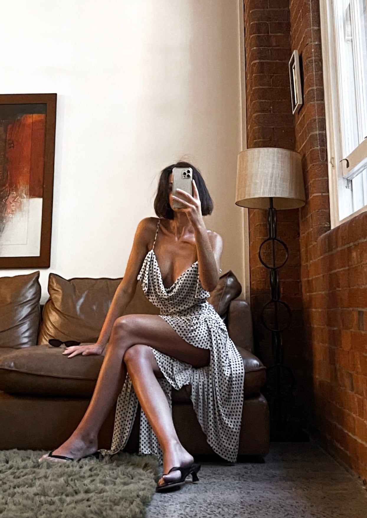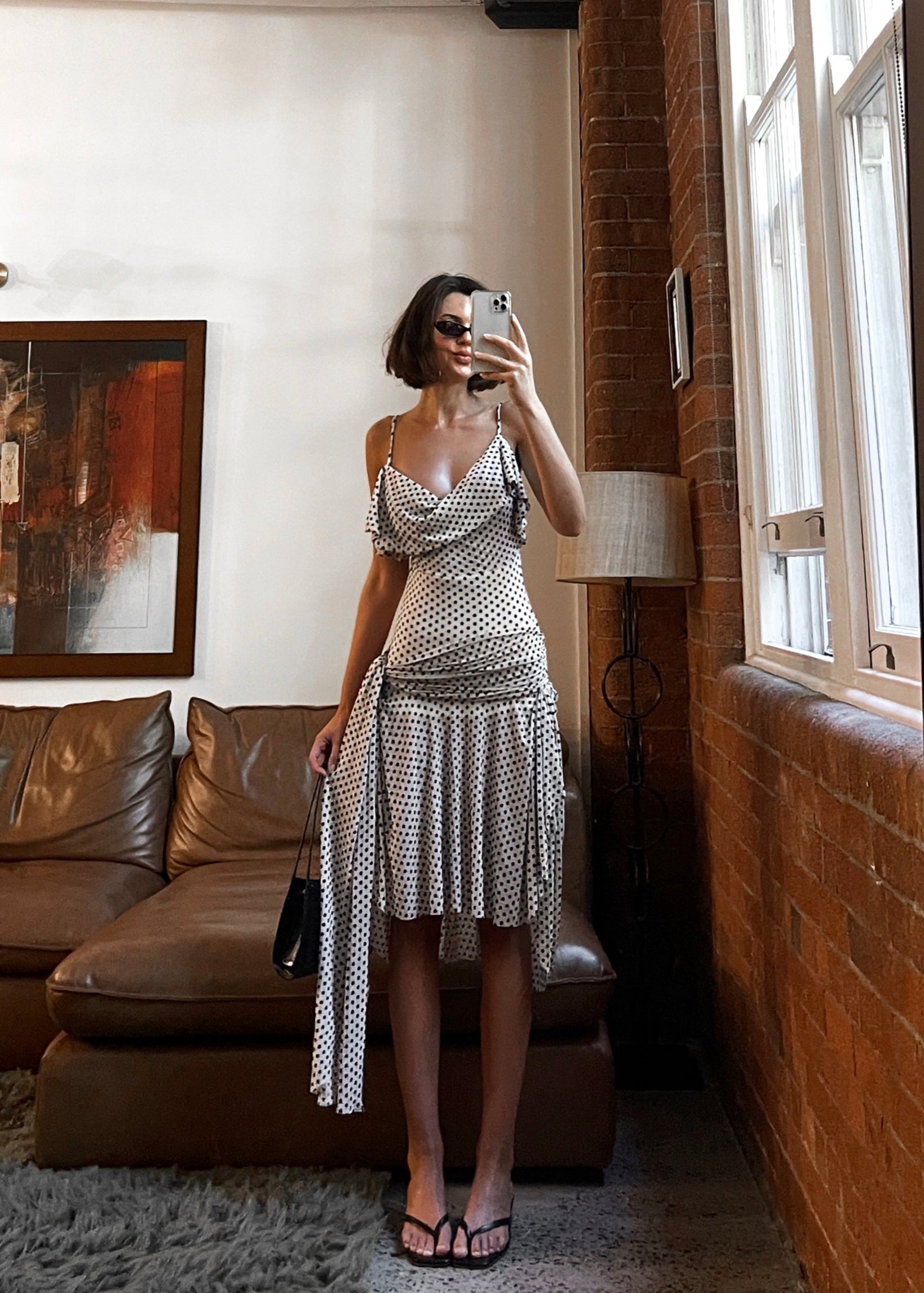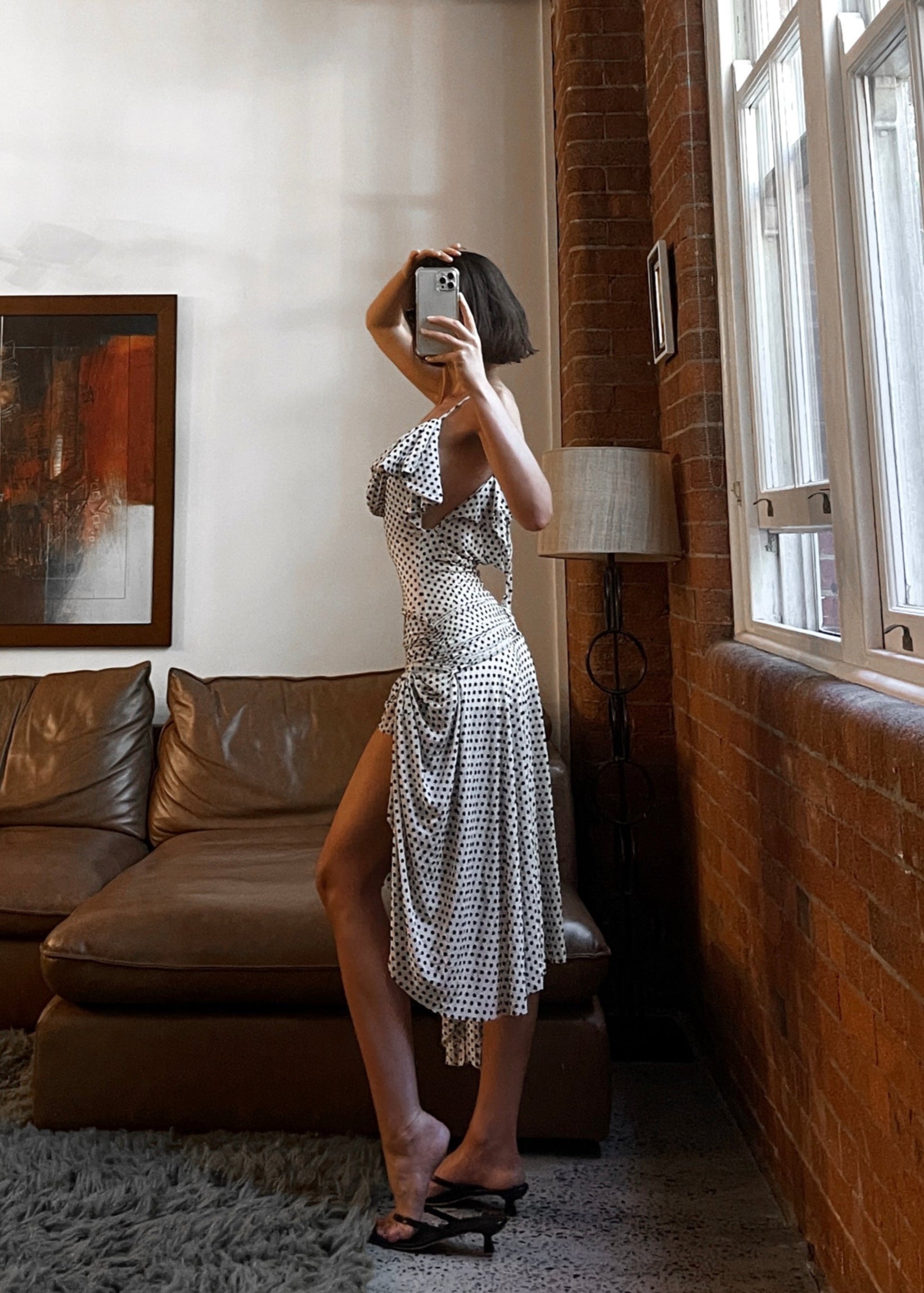 Designed in a wrap-style silhouette, she features a plunging neckline framed by delicate spaghetti straps and a softly draped bodice. The high-low hemline creates a sense of flow with every step, while the sleeveless cut adds ease and versatility. Better yet, this style can be worn multiple ways, draped off and around the shoulder or tied tighter or looser at the waist, to suit your shape and your mood. A true day-to-night showstopper.