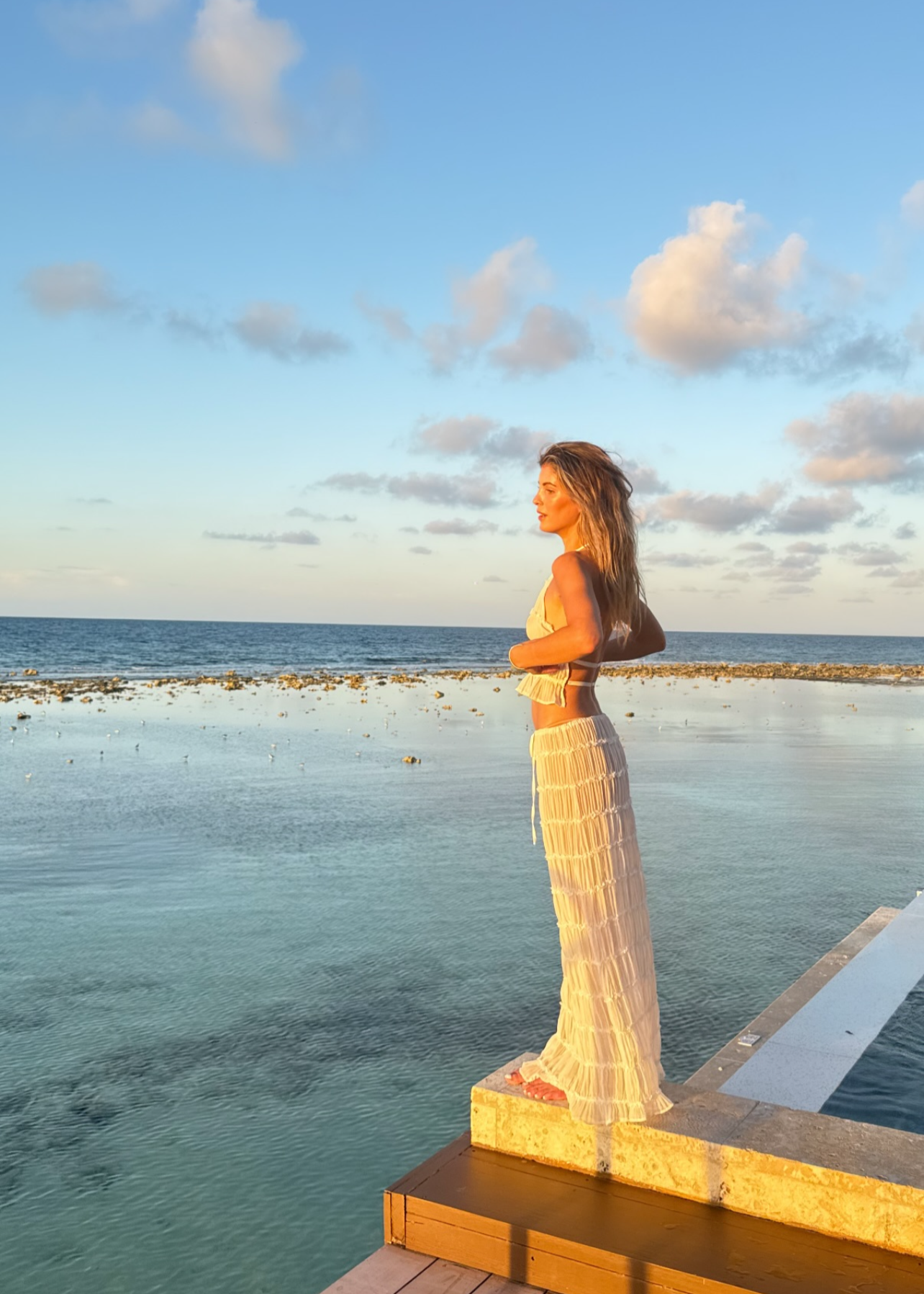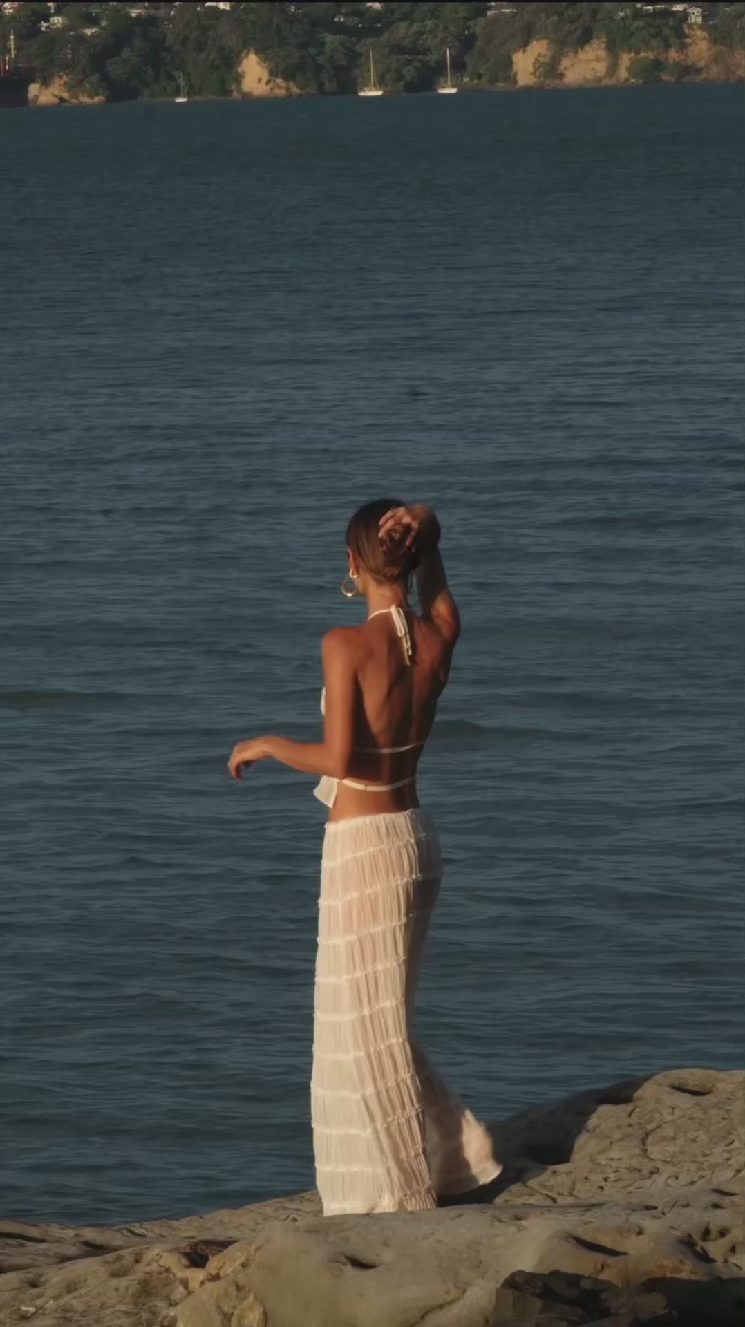 Crafted from a beautiful semi sheer pleated chiffon, this vintage inspired design features ruched gathering all over with a delicate lined lace throughout. The tie up halter neck top is backless with adjustable straps that cinch at the waist. The maxi skirt cascades to the foot, complete with a bow detail at the waist front. Wear together or as separates or style the skirt as a strapless dress! This outfit is lightweight and perfect for resort.