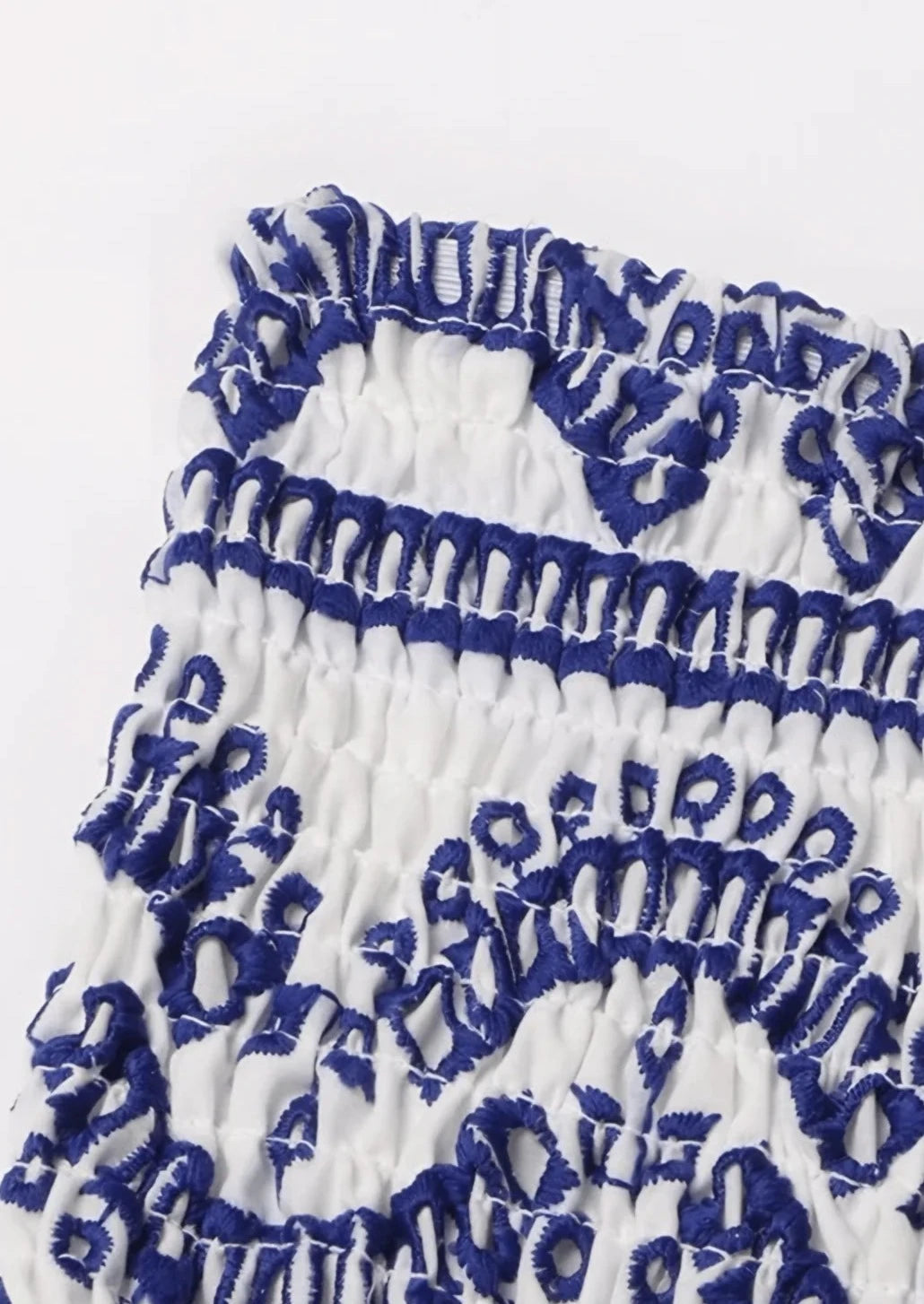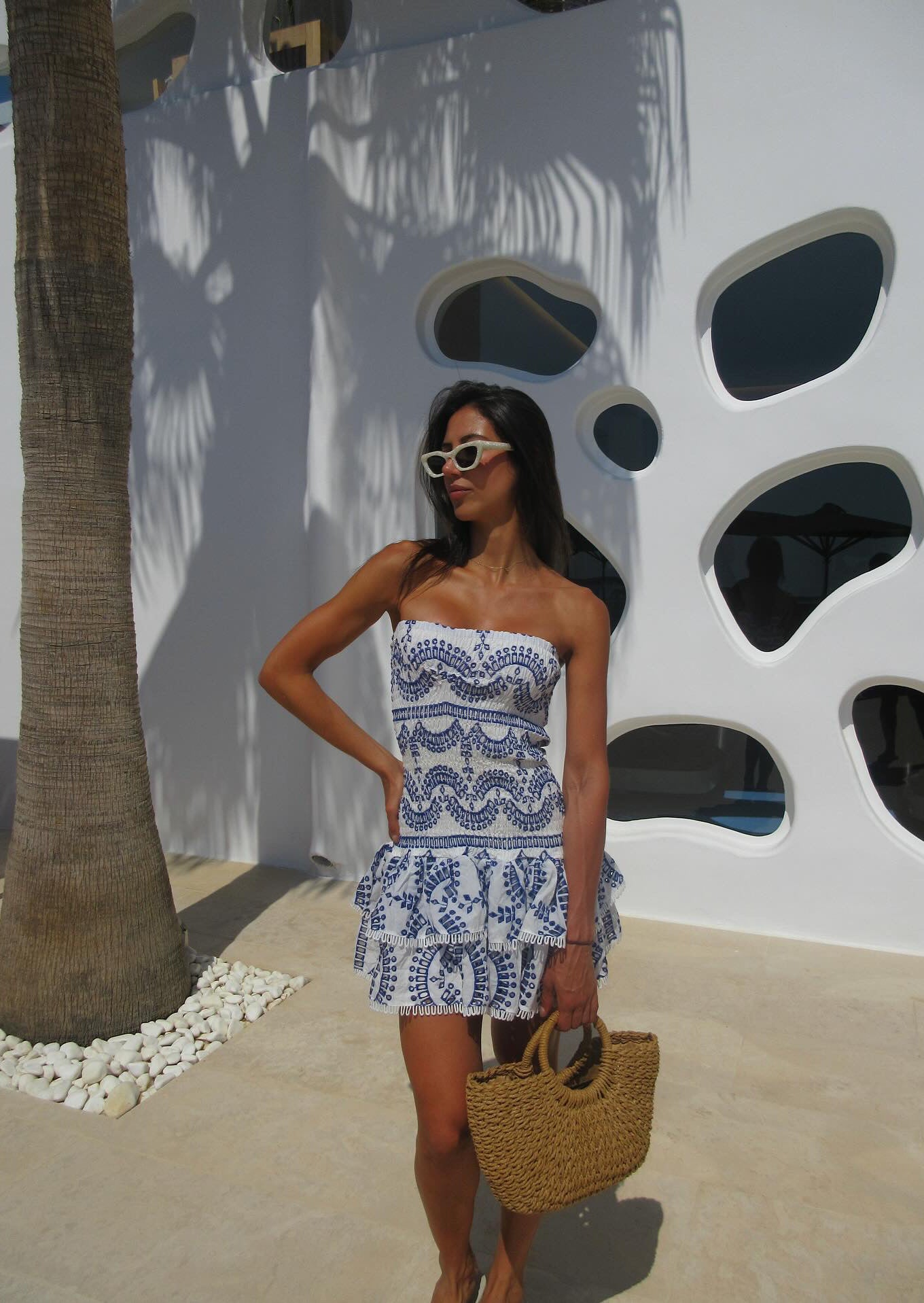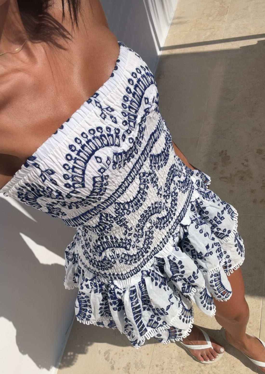 Crafted from a beautiful cotton blended embroidered anglaise, the Santorini is an effortless piece to throw on for day to night wearing. She is a strapless design with optimal stretch featuring a shaped busted front, designed to hug and cater for all curves of the body. The shirred bodice enhances the figure and falls down to a pretty and romantic flare.