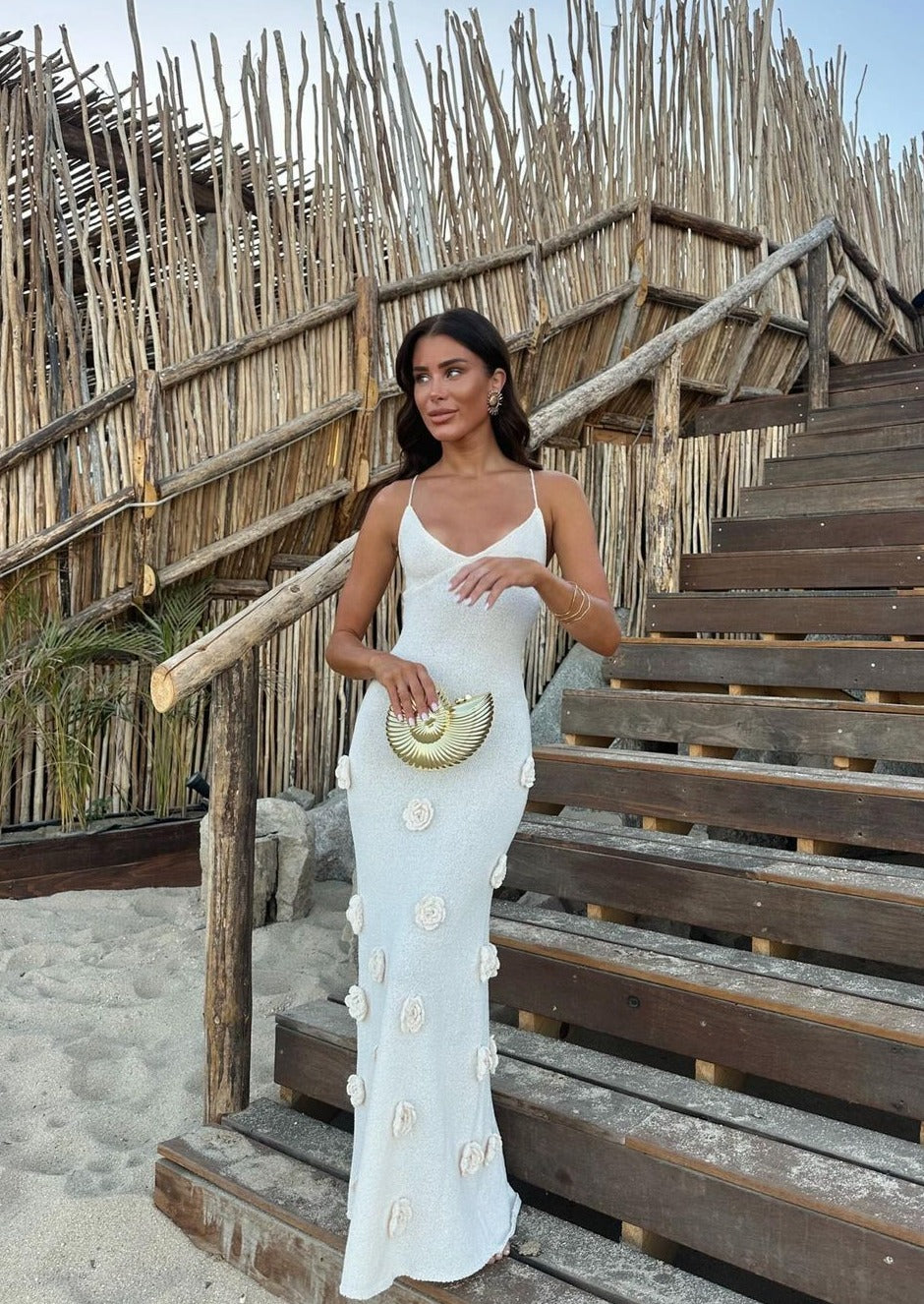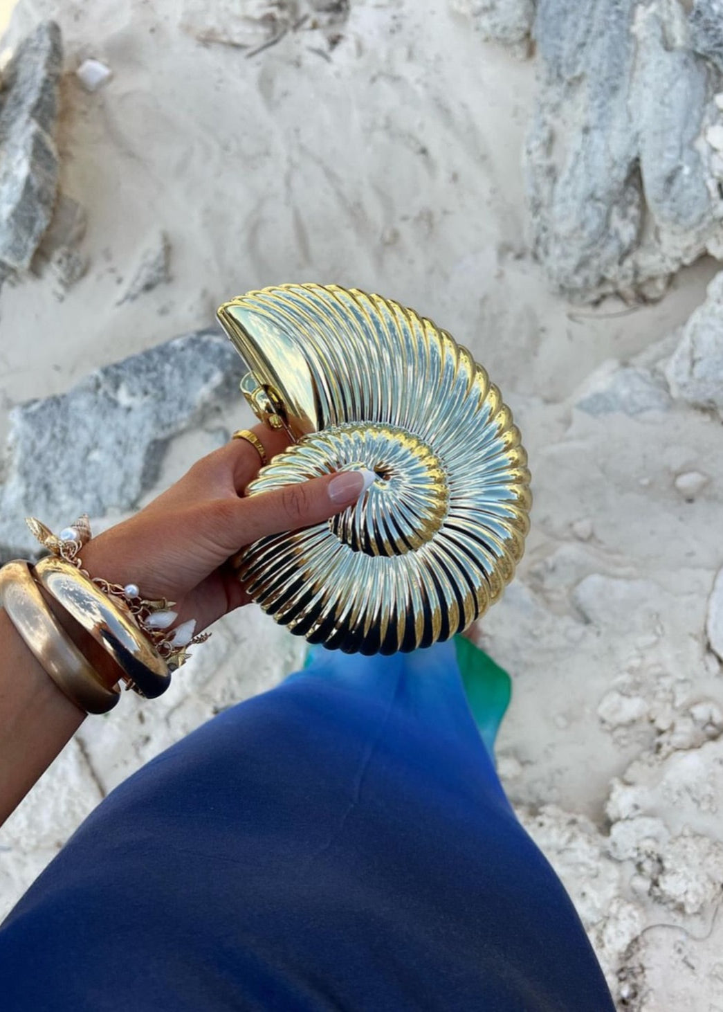 Crafted into an intricate conch shell shape, she features a coil swirl fastener to close. Perfect to match with resort and occasion wear.