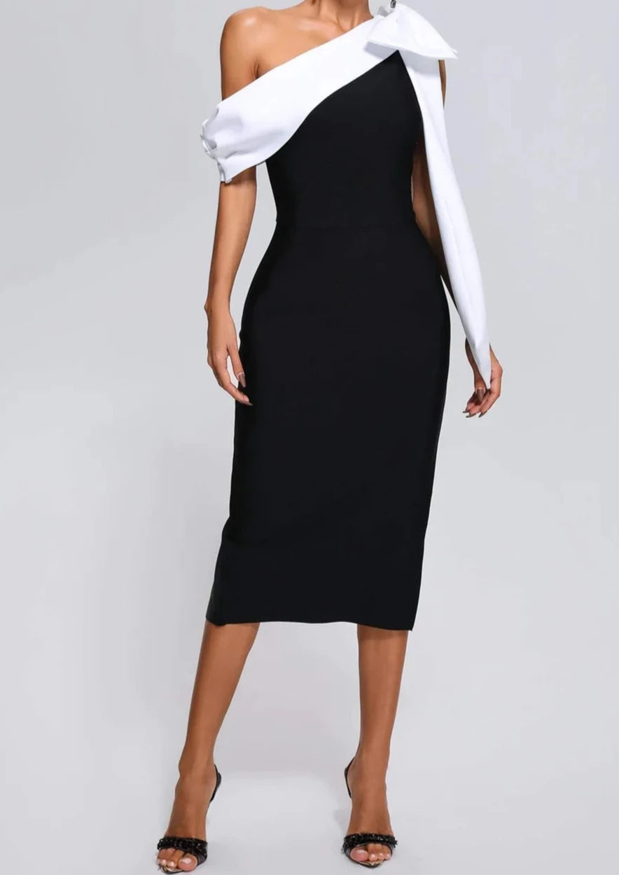 The Valentina is crafted from a thick and luxurious stretch bandage fabrication to cinch and stretch where you need. This one shoulder style features an accentuated white sash bow wrapped from décolletage to back with an inner invisible silicone non-slip trace. She is an extremely flattering fit with a back midi split and an invisible side zip to close. Valentina will give you that old school classic charm that never goes out of style.